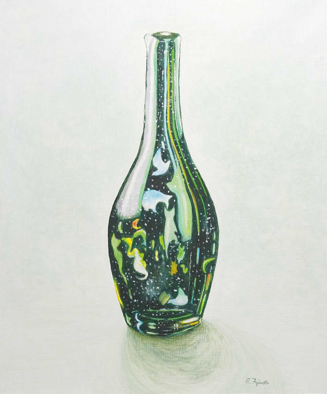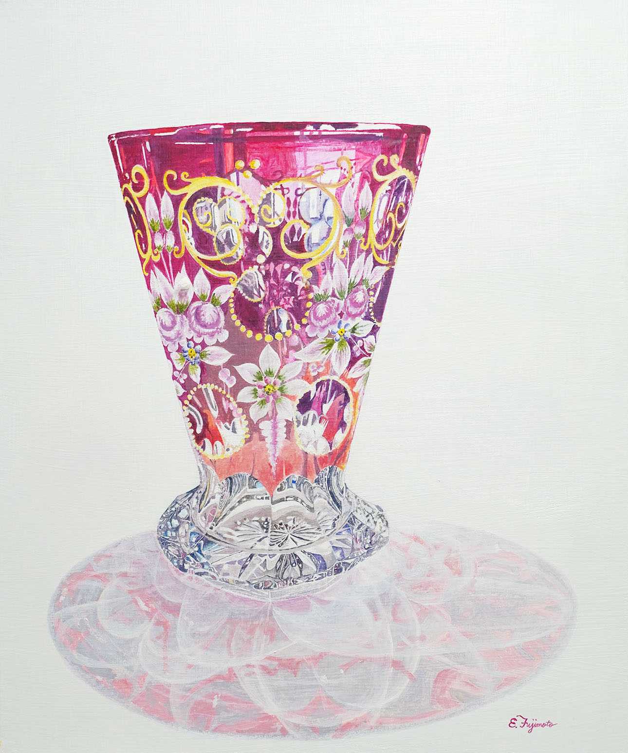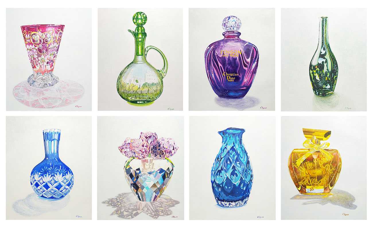 身近にあるガラスの壺に当たる光の変化を通して、色彩の美しさを描いた。人が目にする色彩は、モノに当たった光のうち、表面で反射される光の色だが、ガラスのように透明・半透明の物質では、大部分の光は反射されずにその内部を屈折しながら透過してゆく。ガラスの壺となると、内部の空間で更に屈折、透過、反射して、幻想的な風景や摩訶不思議な像を結んだりする。着色ガラスの色、壺のフォルム、ガラスの厚さや表面の凹凸によって、まぶしく輝く光や色は、独自の神秘的な煌めく世界を作り出す。