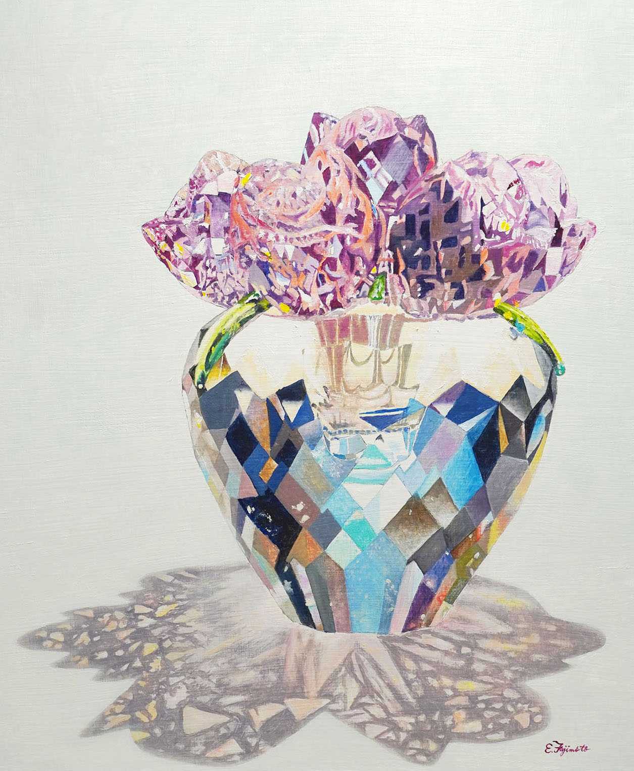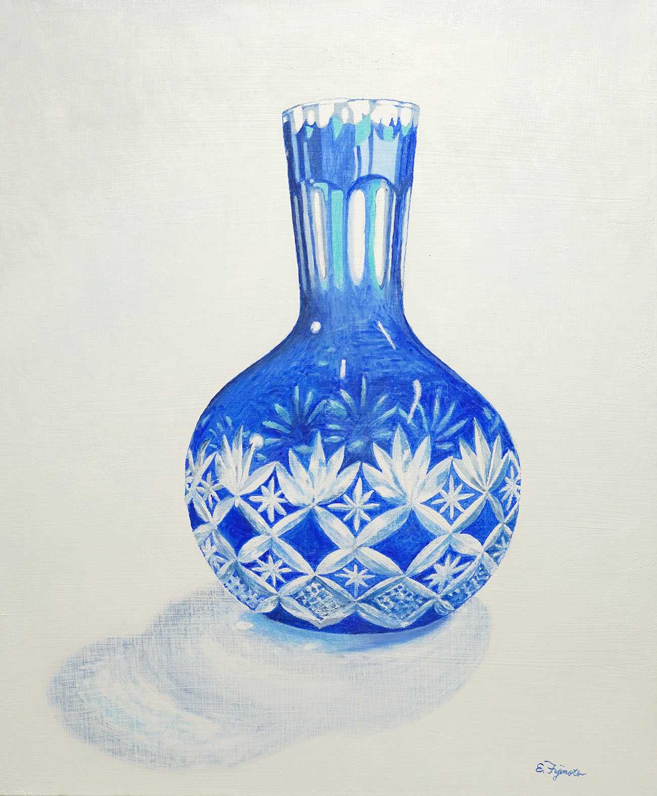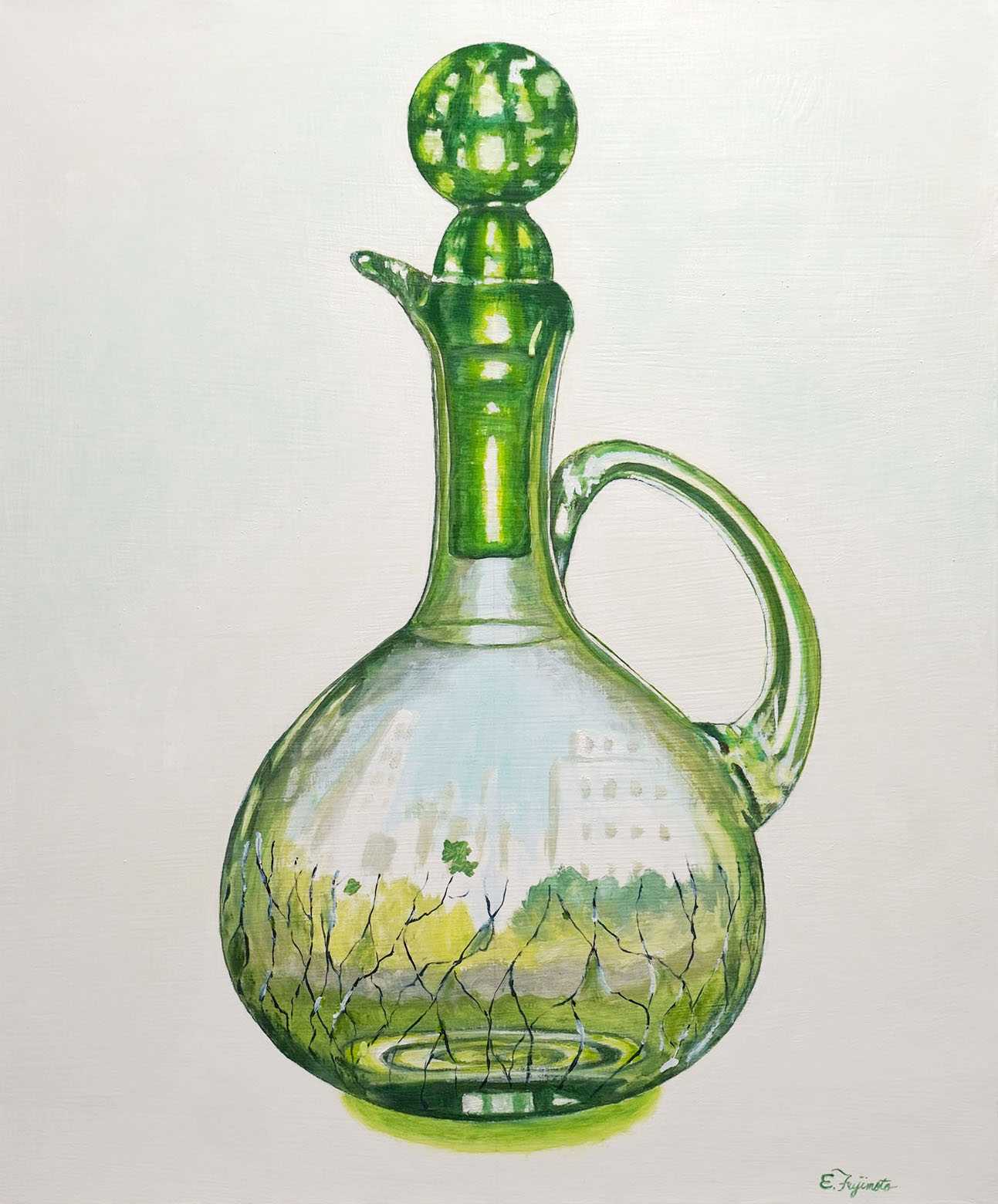 身近にあるガラスの壺に当たる光の変化を通して、色彩の美しさを描いた。人が目にする色彩は、モノに当たった光のうち、表面で反射される光の色だが、ガラスのように透明・半透明の物質では、大部分の光は反射されずにその内部を屈折しながら透過してゆく。ガラスの壺となると、内部の空間で更に屈折、透過、反射して、幻想的な風景や摩訶不思議な像を結んだりする。着色ガラスの色、壺のフォルム、ガラスの厚さや表面の凹凸によって、まぶしく輝く光や色は、独自の神秘的な煌めく世界を作り出す。
