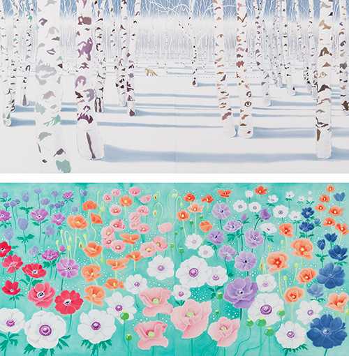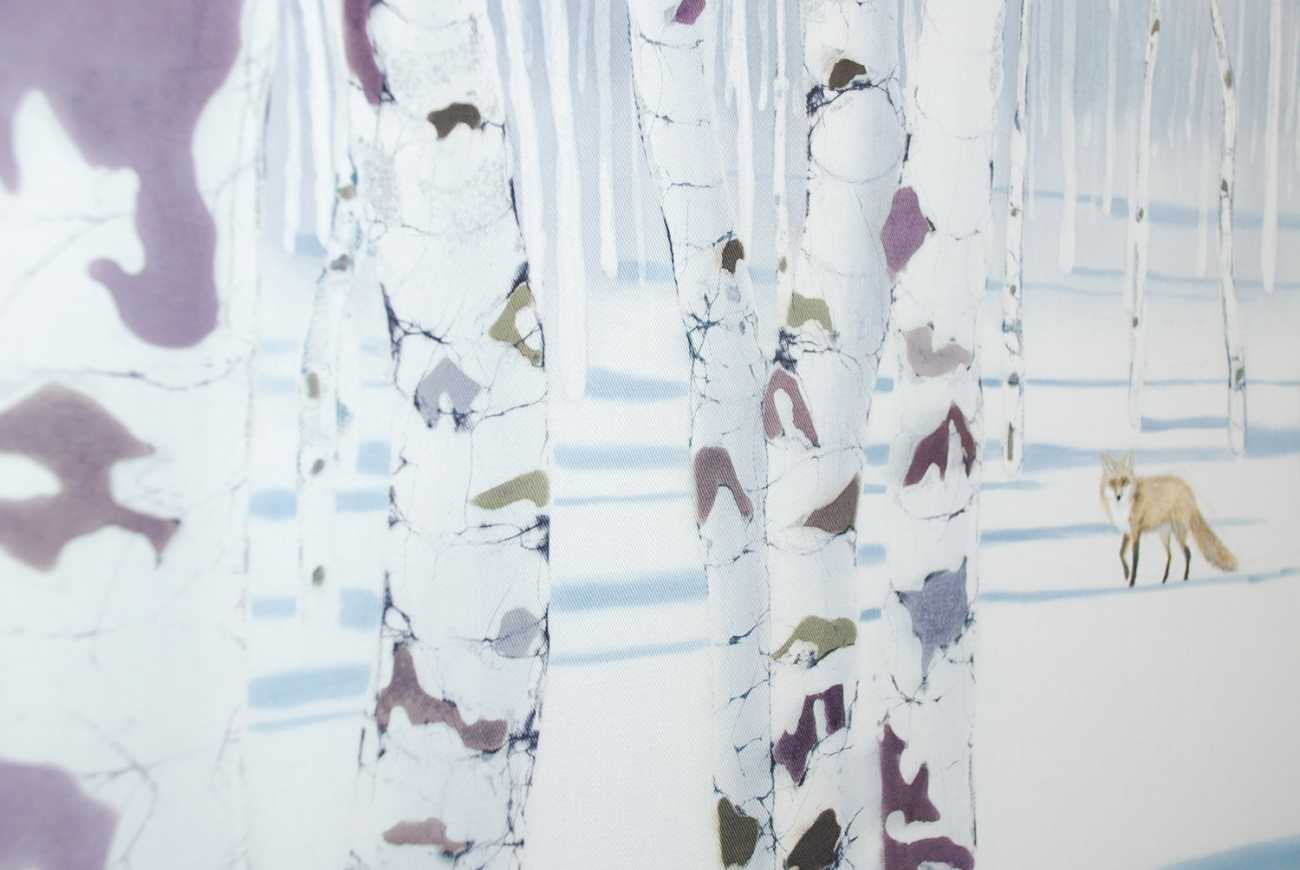 この作品では、 冬の晴れた日に明るい陽ざしを浴びる白樺と、春になりつぎつぎと開花するアネモネとポピーの群生をテーマにした。冬の白樺には蠟染の亀裂を、春の花には蠟で筆描きすることによるやわらかな輪郭線をもちい、その季節と植物の空気感を表現した。