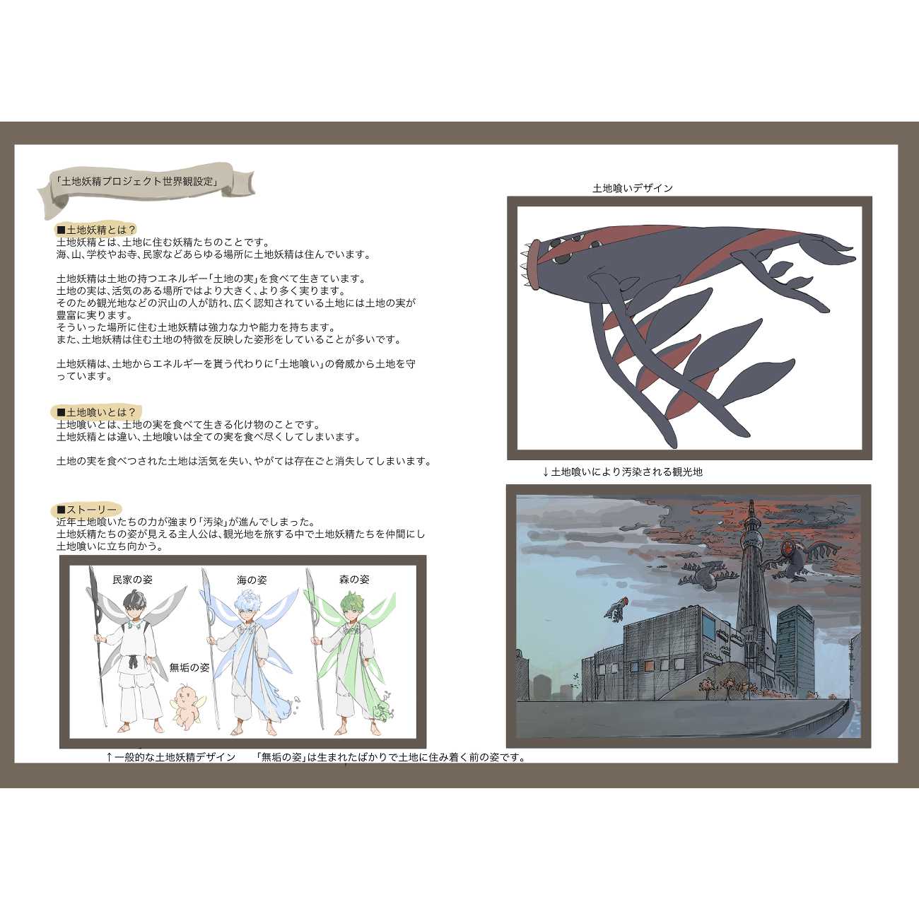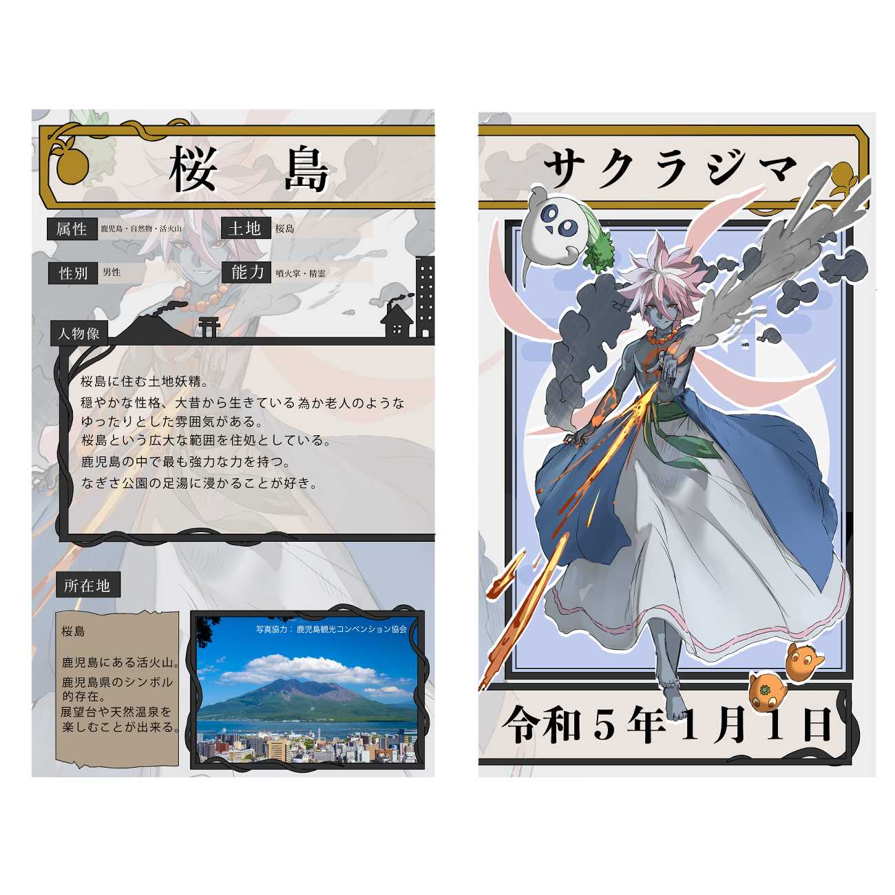 今回の制作では、「土地妖精プロジェクト」という世界観設定を元に、鹿児島県の観光地をモチーフにしたキャラクターを4体作成し、それをまとめた図鑑を作成しました。