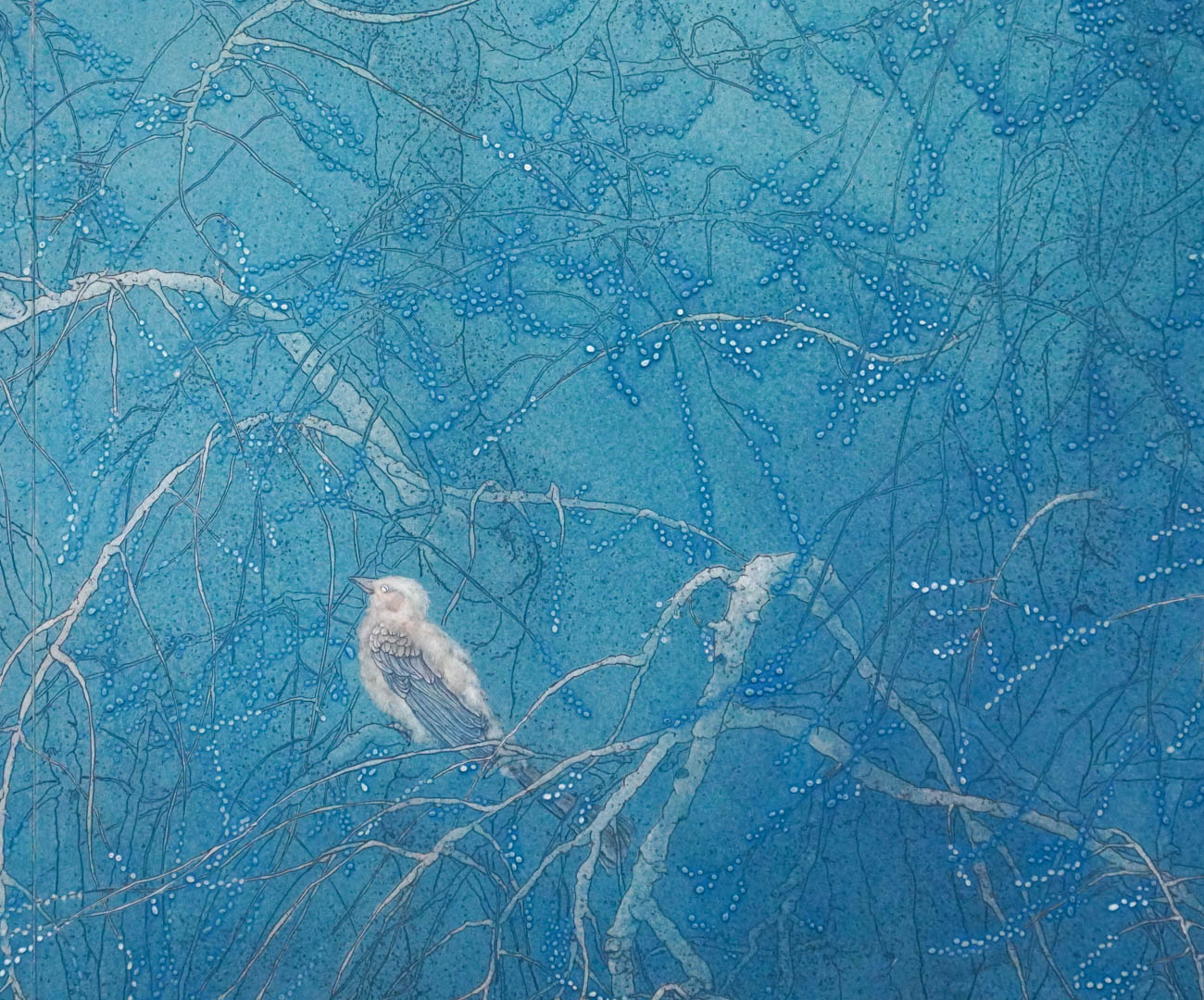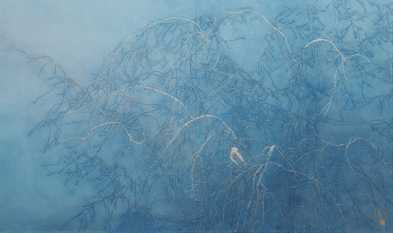 雪が降り積もった庭で、春においでと手を差し伸べるかのように東の方角に枝を伸ばす枝垂れ桜と、その樹に寄り添うように羽を休める一羽のヒヨドリを描きました。