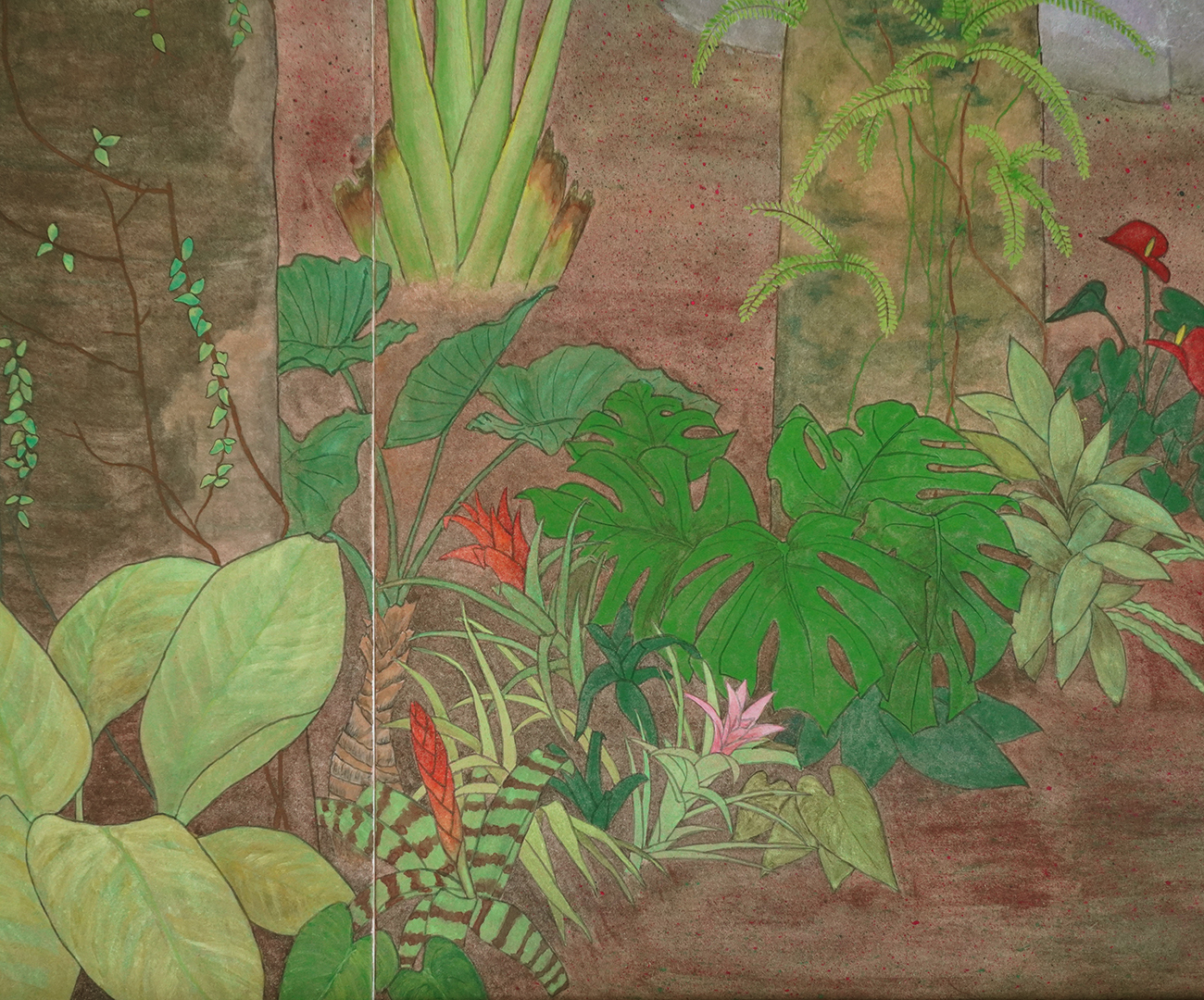 植物園の温室の風景を基に描きました。小さな温室だったので奥深く林が続いている様に想像しながら描きました。ふと林の中を散策してみたいなと感じる作品になっていると嬉しいです。