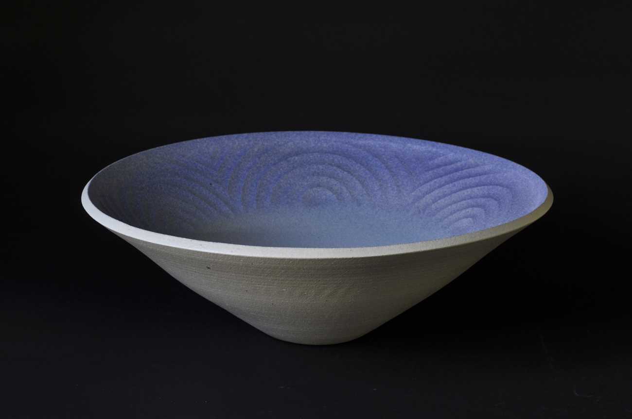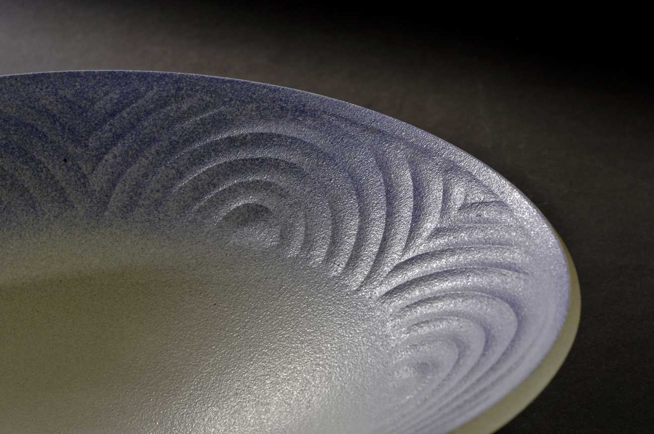 ろくろ形成で器を制作して表面に渦紋様を描き、手彫りして素焼き後、コバルト化粧土を渦面に施し白マット釉を中心から小口に向かって施釉し還元にて本焼きしました。