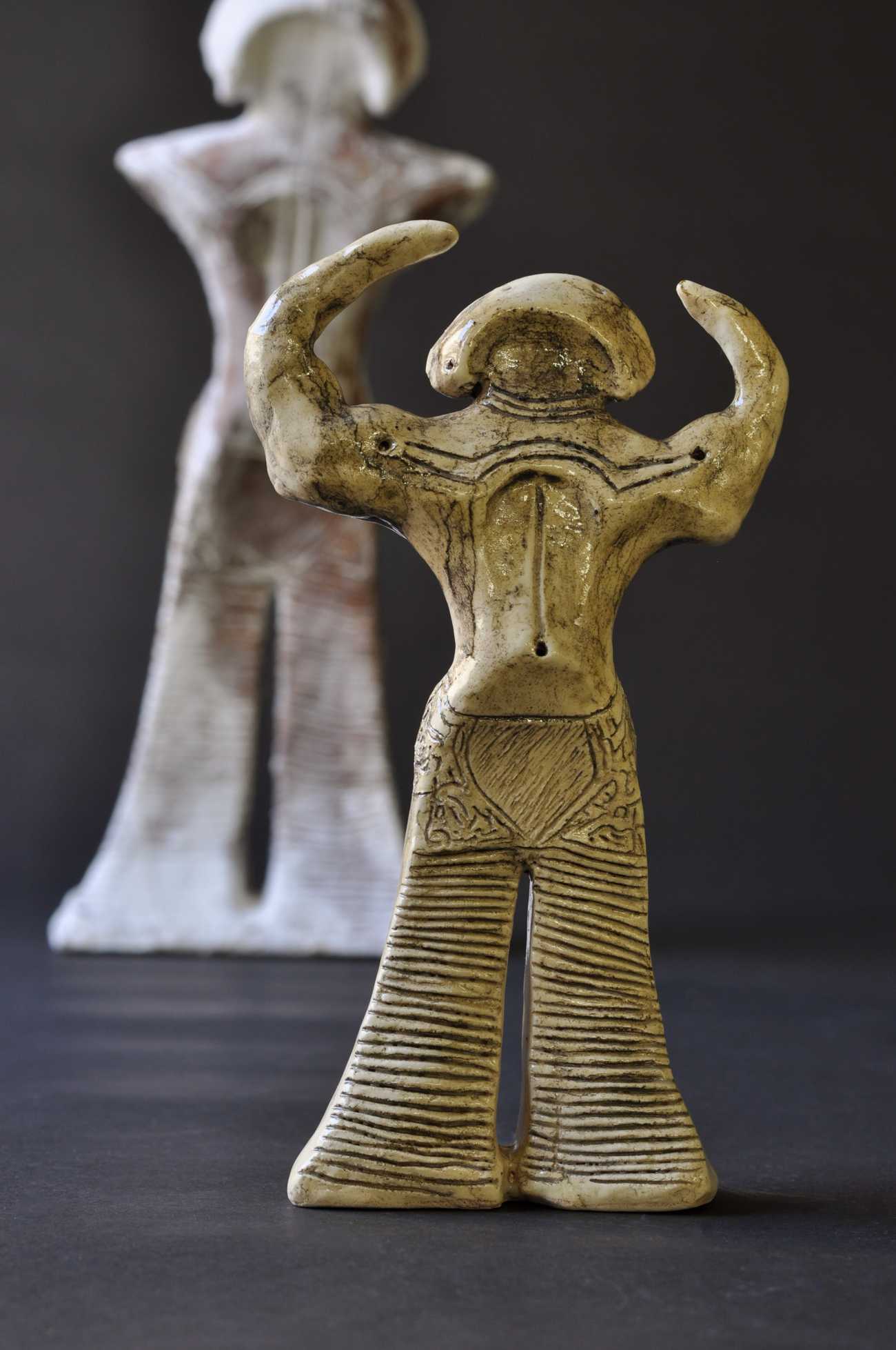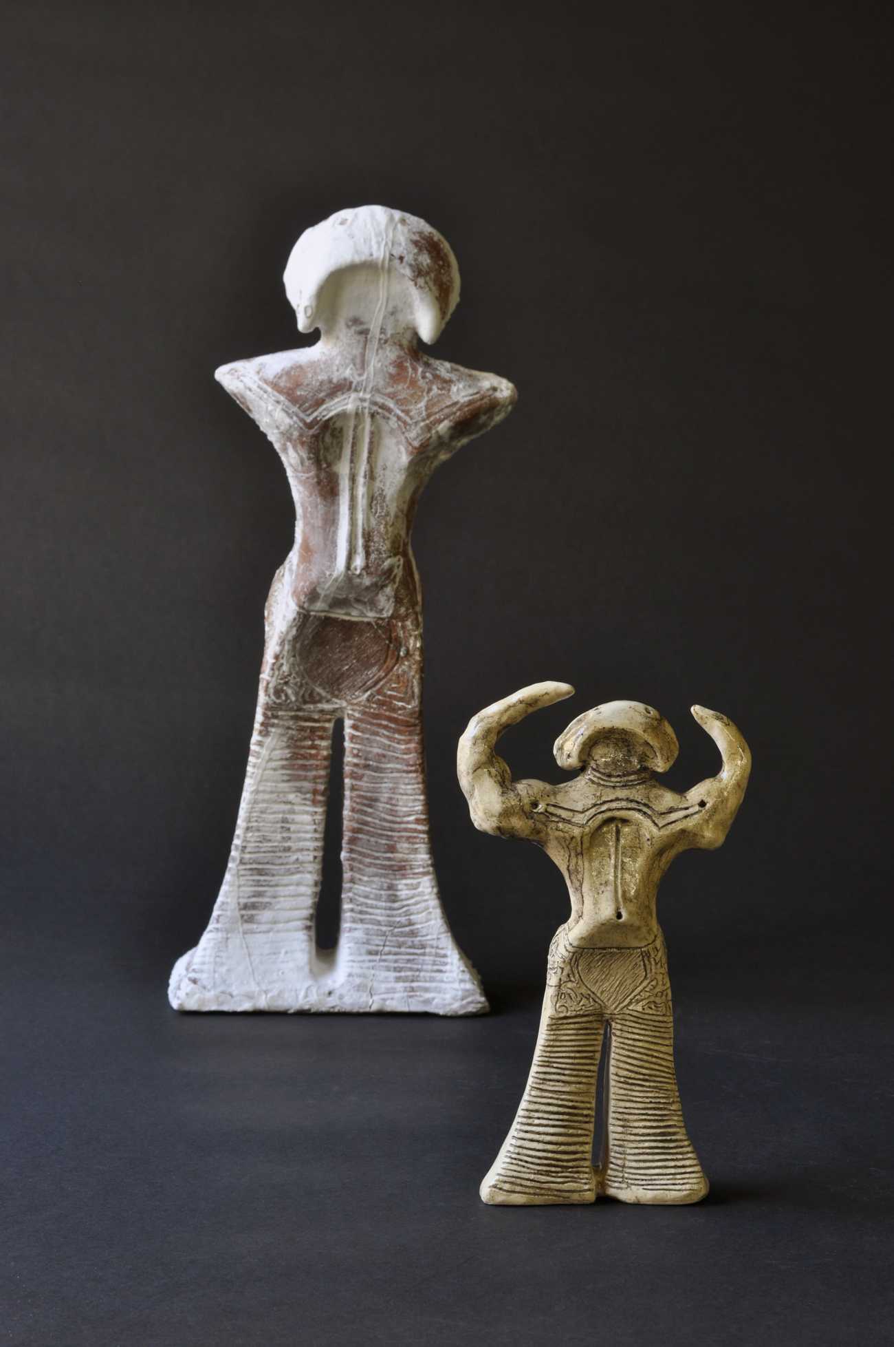 地元から出土した『縄文の女神』をモチーフとして、地元で採れる素材を使って制作。それぞれの名前を『縄文雪守女神』『おらら神』『一歩前進神』『縄文フィアンセ』とした。