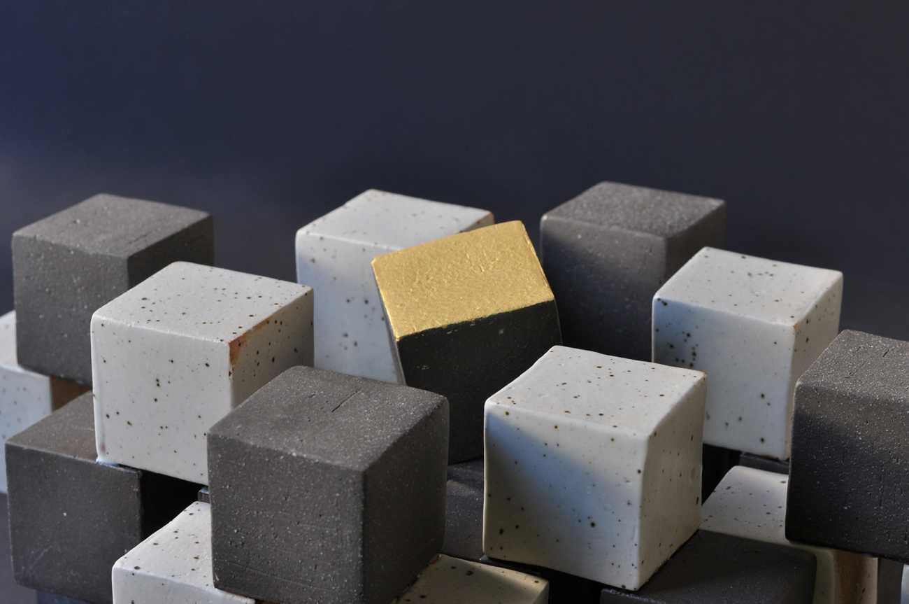 「cube assembly」の作品タイトルの通り立方体の集まりをコンセプトとし、正六面体の4つキューブを十字につなぎ合わせた8つのパーツと5個のキューブを使いオブジェを作成しました。オブジェのセンターには核となるキューブを中心に据え、8つのパーツを四方に配置しました。中心となるキューブは取り替えることによりオブジェ全体のイメージを変えられるようにしました。またセンター下のキューブ側面に満月・十六夜・上弦・三日月を描き、回転することで月齢を示すことが出来るようにしました。展示は作品の正面を左にずらしエッジが強調出来るよう斜めに配置し、黒の台座の上に置きシャープさとコントラストを強調しました。
