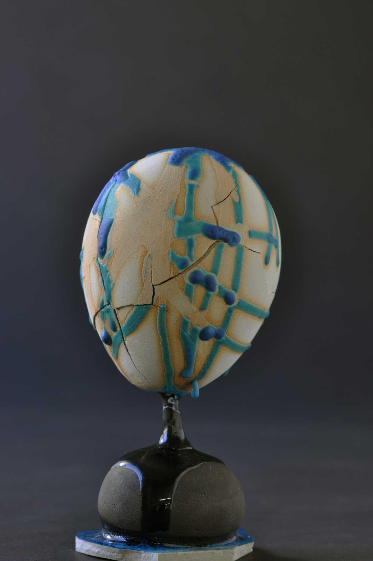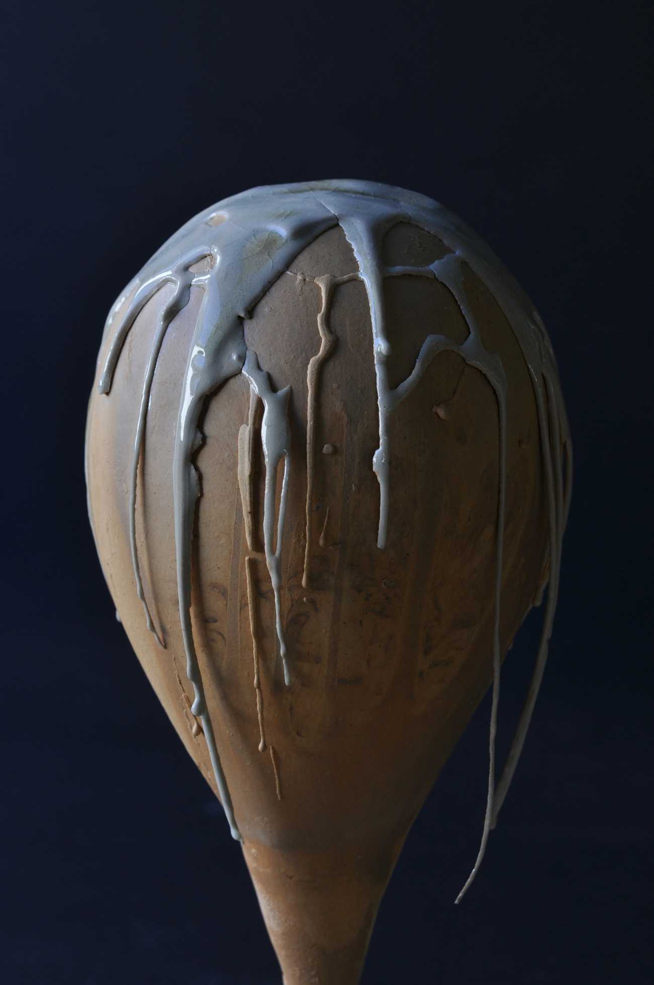 流れ、滴り、堆積して層を形成した泥漿は成分や状態を変えることで焼成の段階で様々な変化を見せる。実験的プロセスで生まれた溶解、反り返り、垂れ、割れ、縮みなどの変化する土の表情と融点や流れを調整した釉薬が生み出す世界を楽しんだ制作であった。