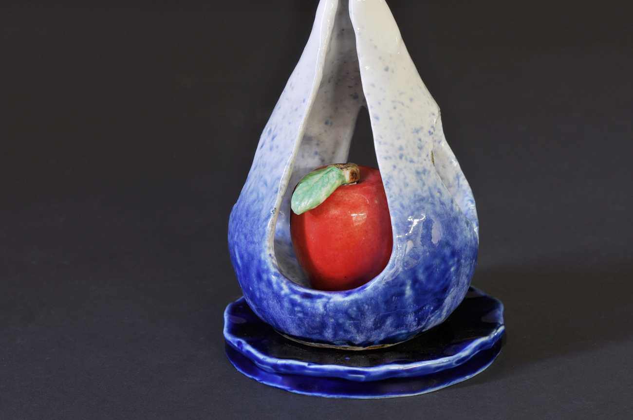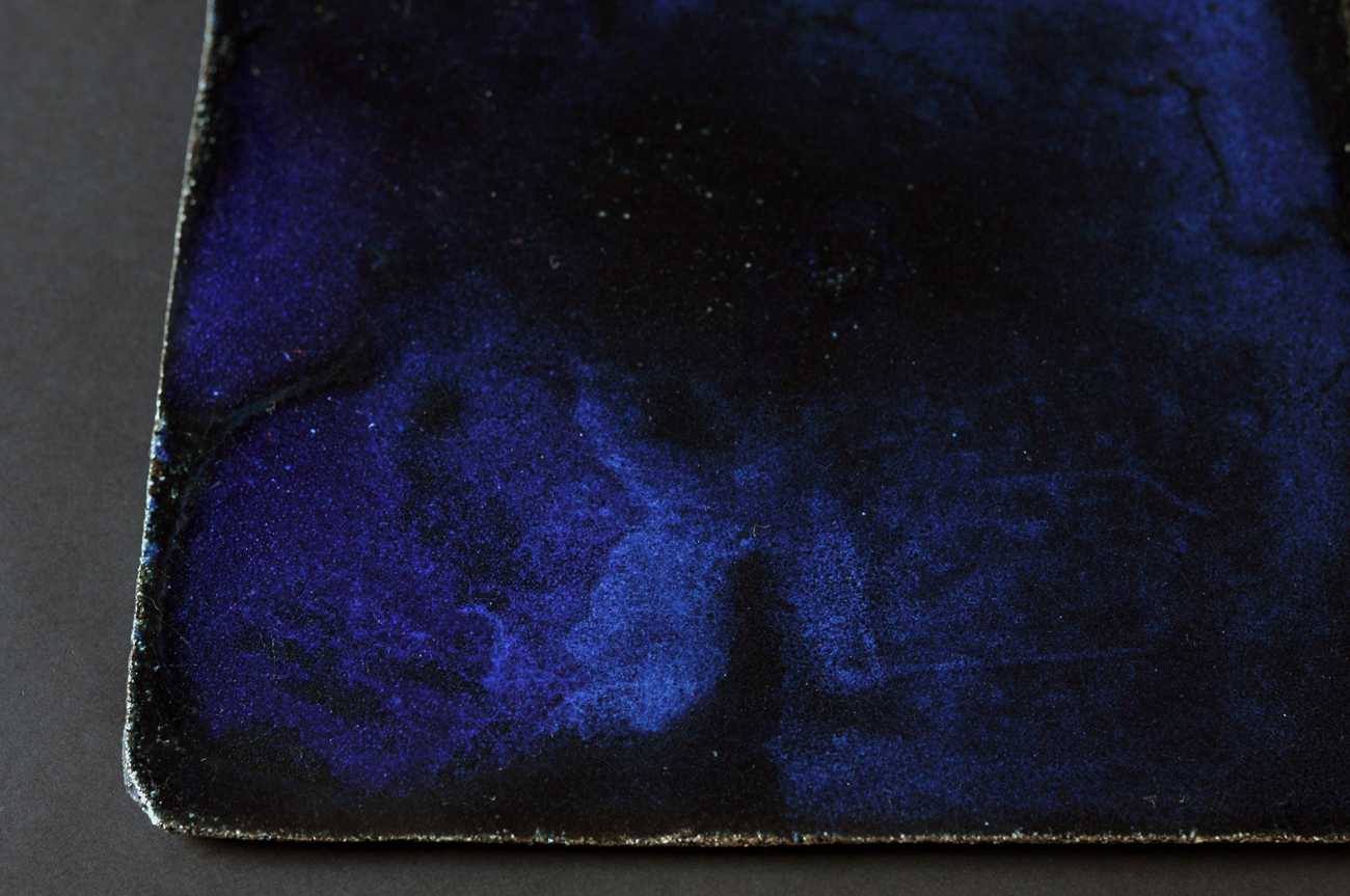 旧約聖書・天地創造の中で創造される「水」「光」「闇」「大空」「地」「海」「果樹」「星」などのキーワードをちりばめながら、「瑠璃色の地球、命・多様な世界を照らし見守る月」をテーマに統一した世界観をシンブルな「花器」「皿」で表すことに取り組みました。「皿」は、月齢23日程度の「三日月」、黒・白・半磁器・赤・混合土により多様世界を象徴する「大陸(地)」を表現した「5つの中皿」、瑠璃色の「地球」を「海」と「天空(闇・大空・星)」で表現した大きな正方形の「板皿」と、「海面」を表現した三角の「板皿」、そして天からの「水」と、生命の象徴としての「果実」と、「太陽」を表現した中央の「花器」からなる作品。