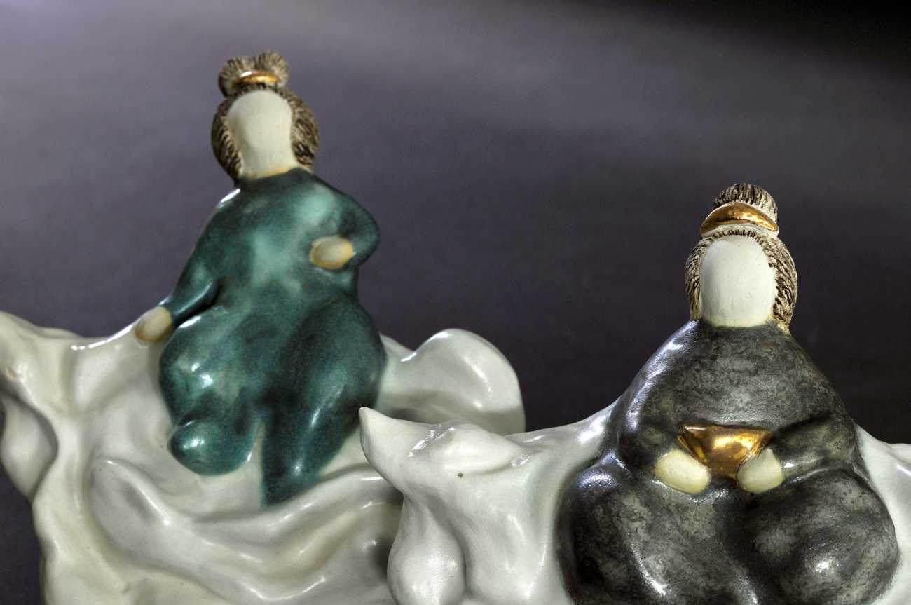 上信楽粘土、乳白マット、チタン結晶、青銅、茶呉須、金彩/酸化/手びねり