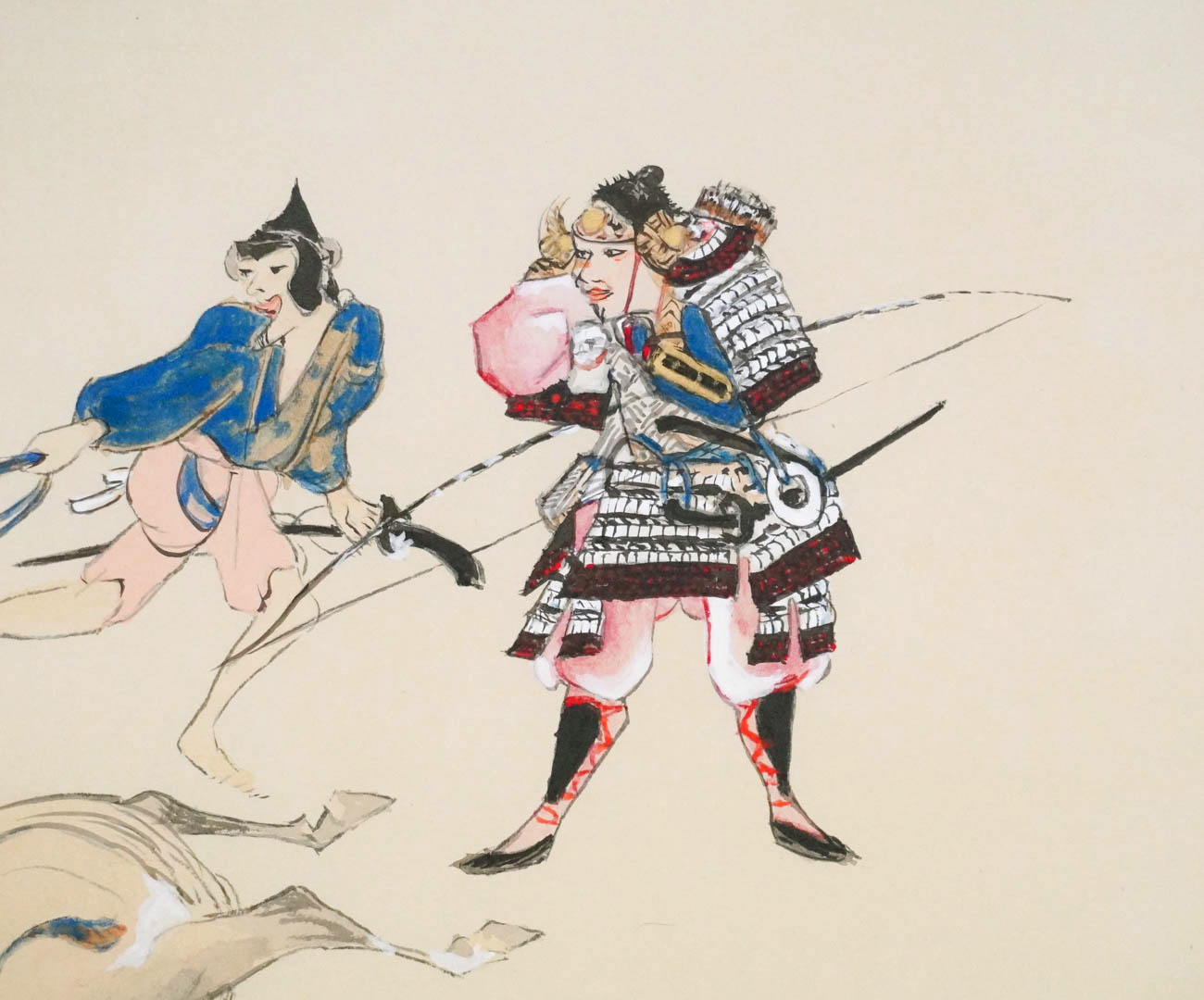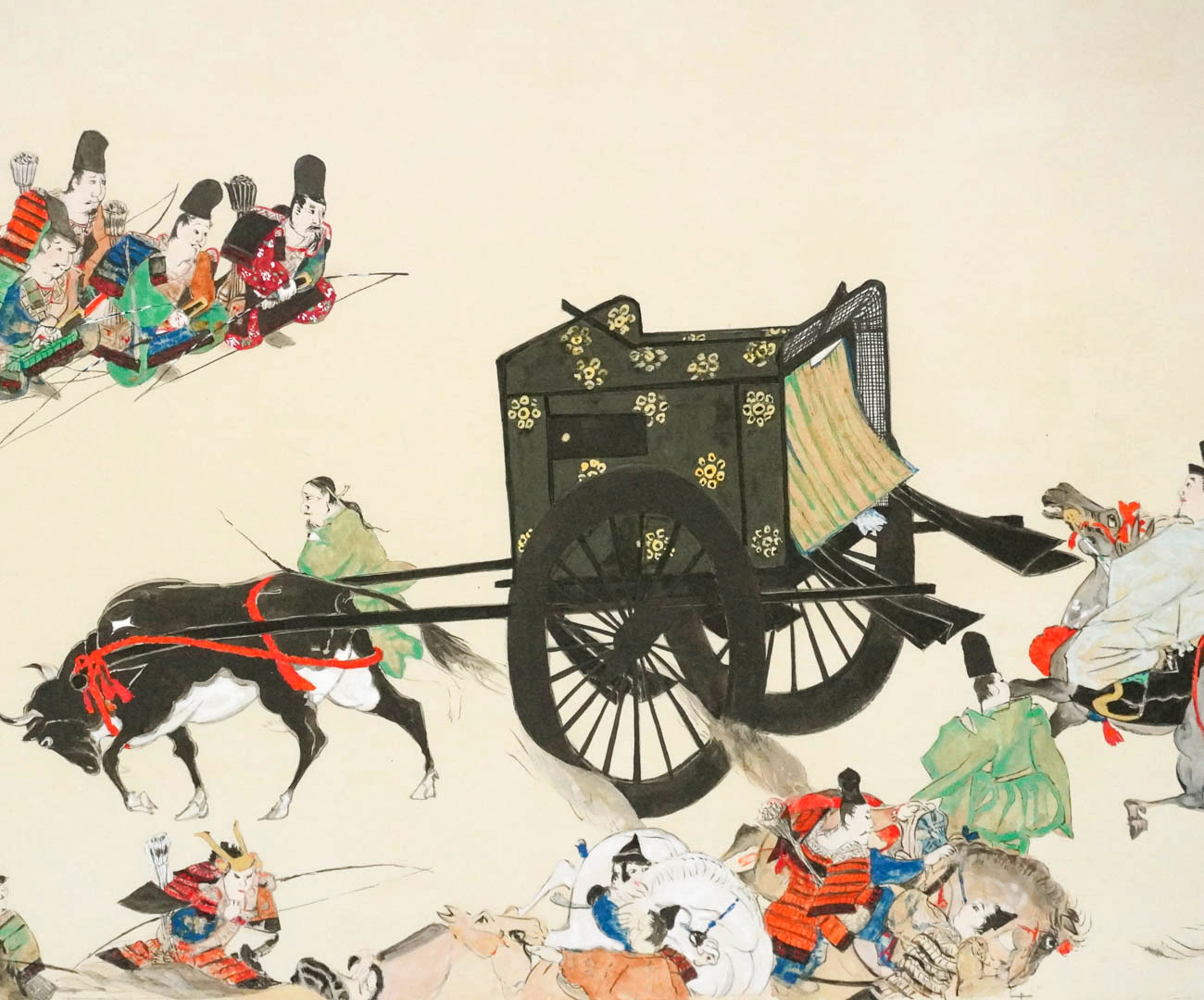 平治の乱(1159年)。幽閉された二条天皇が、女装して内裏を脱出し、藤原経宗、平重盛らとともに、平清盛邸に行幸する場面。武者達のキビキビした表現、動乱の緊迫した息吹が描かれている。時を超えて武者達の思いがひしひしと感じられ、画面に吸い込まれていきました。