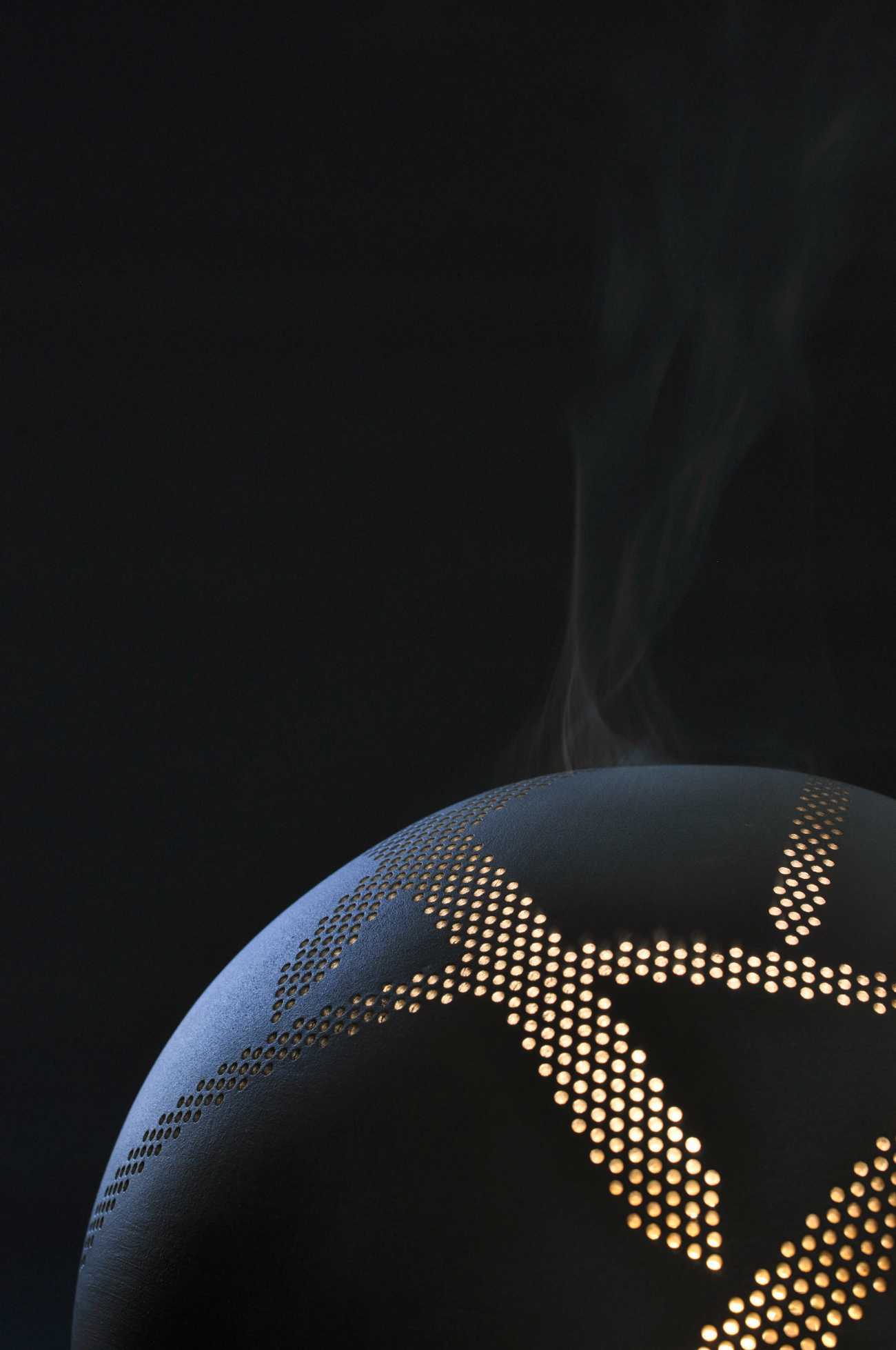 作品の中に「穴」を空けて、機能や造型や光のデザインを表現する事で、「光りと香り」が同時にそ穴を通り抜けて機能や役割を果たす。そんなイメージで作品を創り上げてきた。