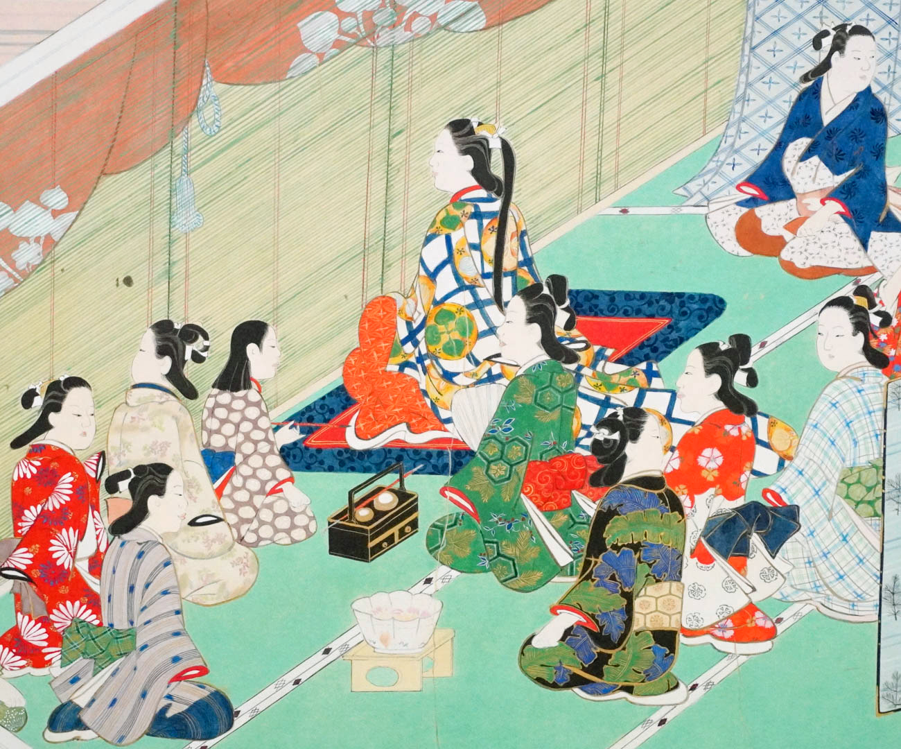 風俗図巻は、肉筆の浮世絵を描いた宮川長春が女舞の一行を3場面に分けて描いた絵巻です。その内、武家屋敷で女性達が芸能鑑賞をしている場面を模写しました。色彩豊かで美しい画面。線の美しさから感じられる職人の技術。感動を覚えながら自分なりに解釈して、絵を読みといて行く時間は、大変貴重な体験となりました。