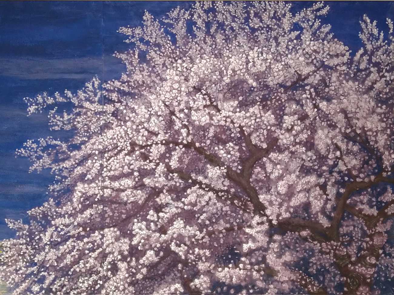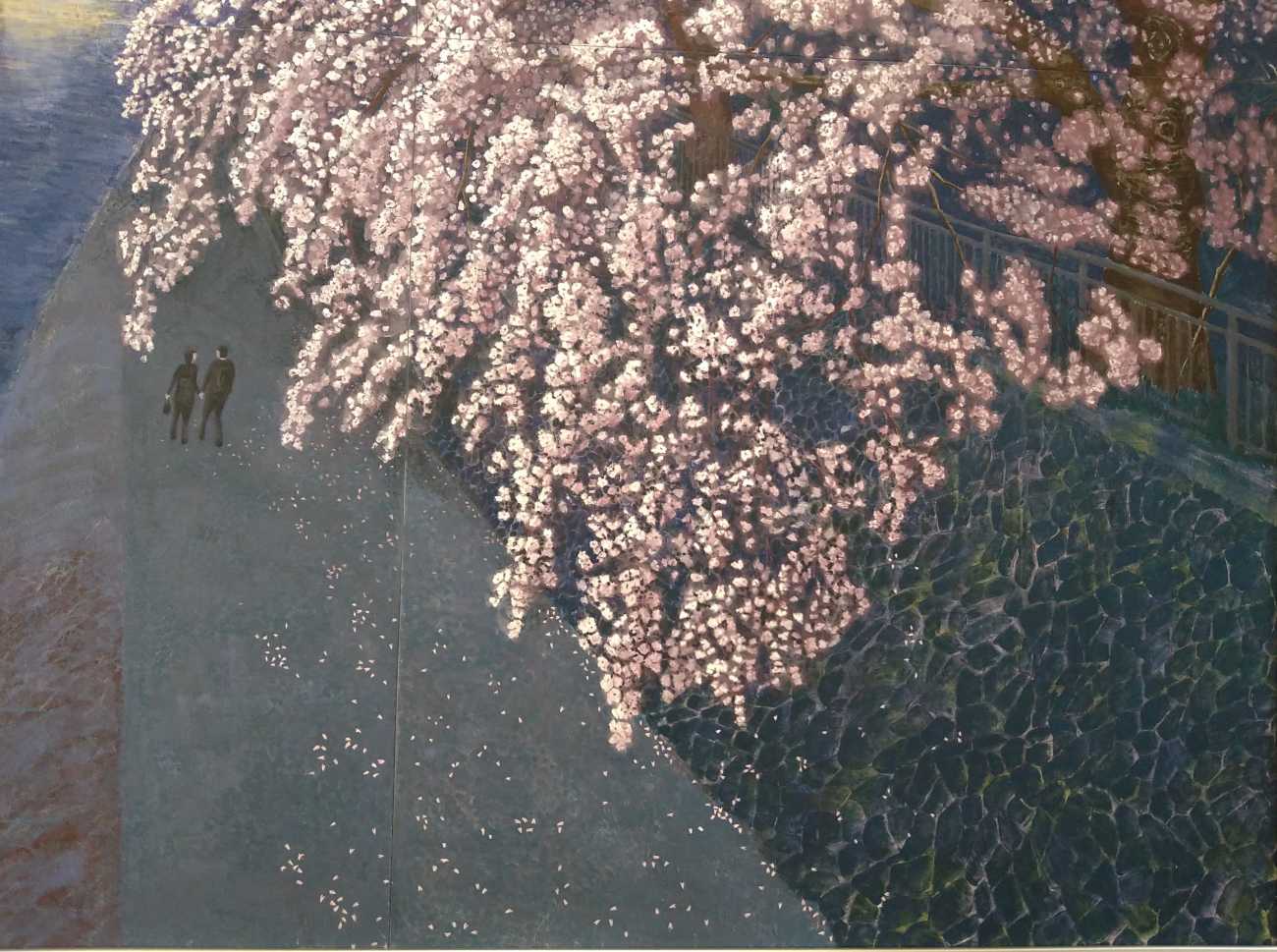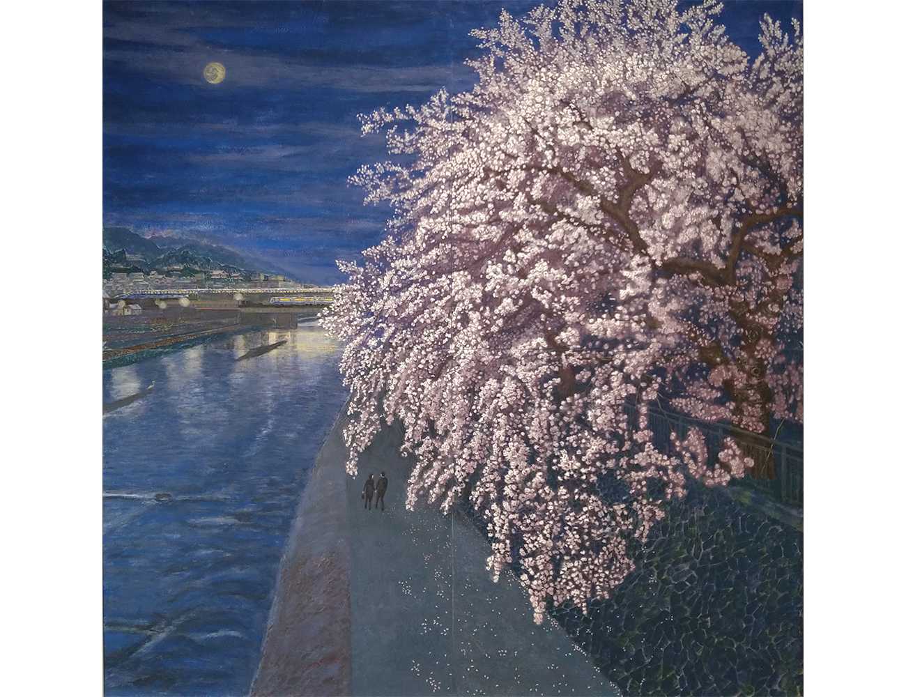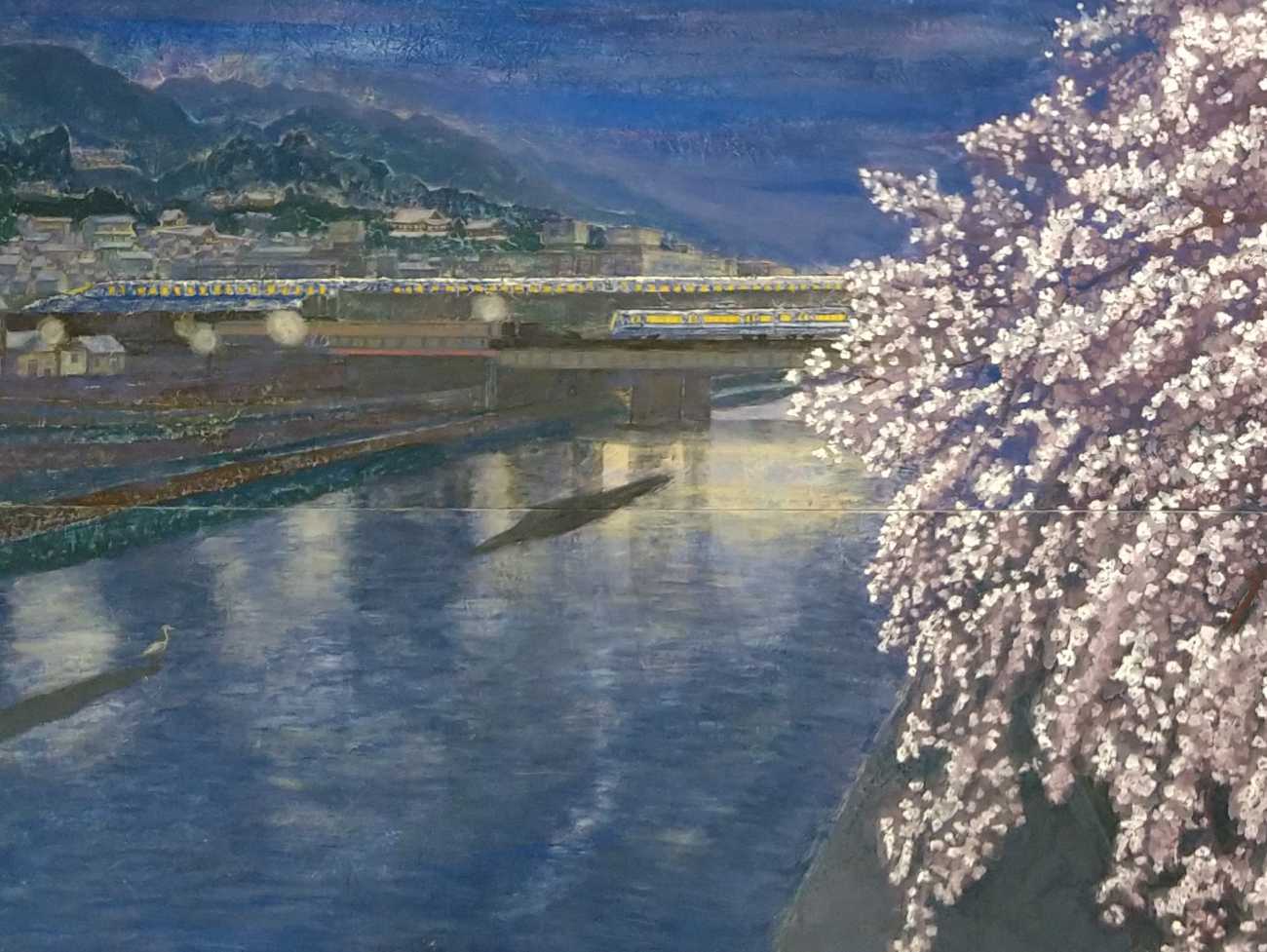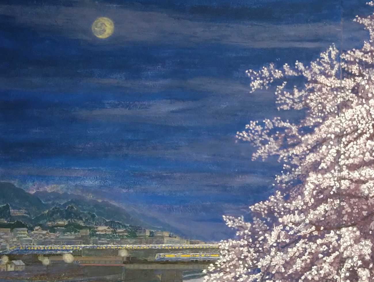 旅景色の集大成として京都鴨川を題材に制作。江戸期に交配され、日本の国花となった「ソメイヨシノ」を近代日本の歴史に思いを巡らしつつ描いた。浮世絵を参考に、夜桜をメインに鉄道や山を遠くに配したスクエアの構図とした。地肌作りに「もみ紙」を採用した。立体感ある夜桜と月夜の川面に映る列車の明りなど京の旅景色を楽しんで頂きたい。