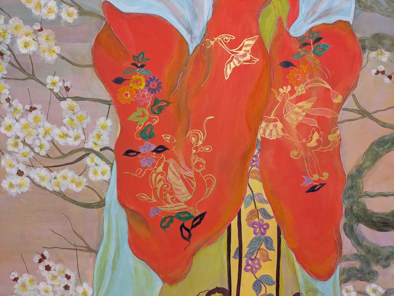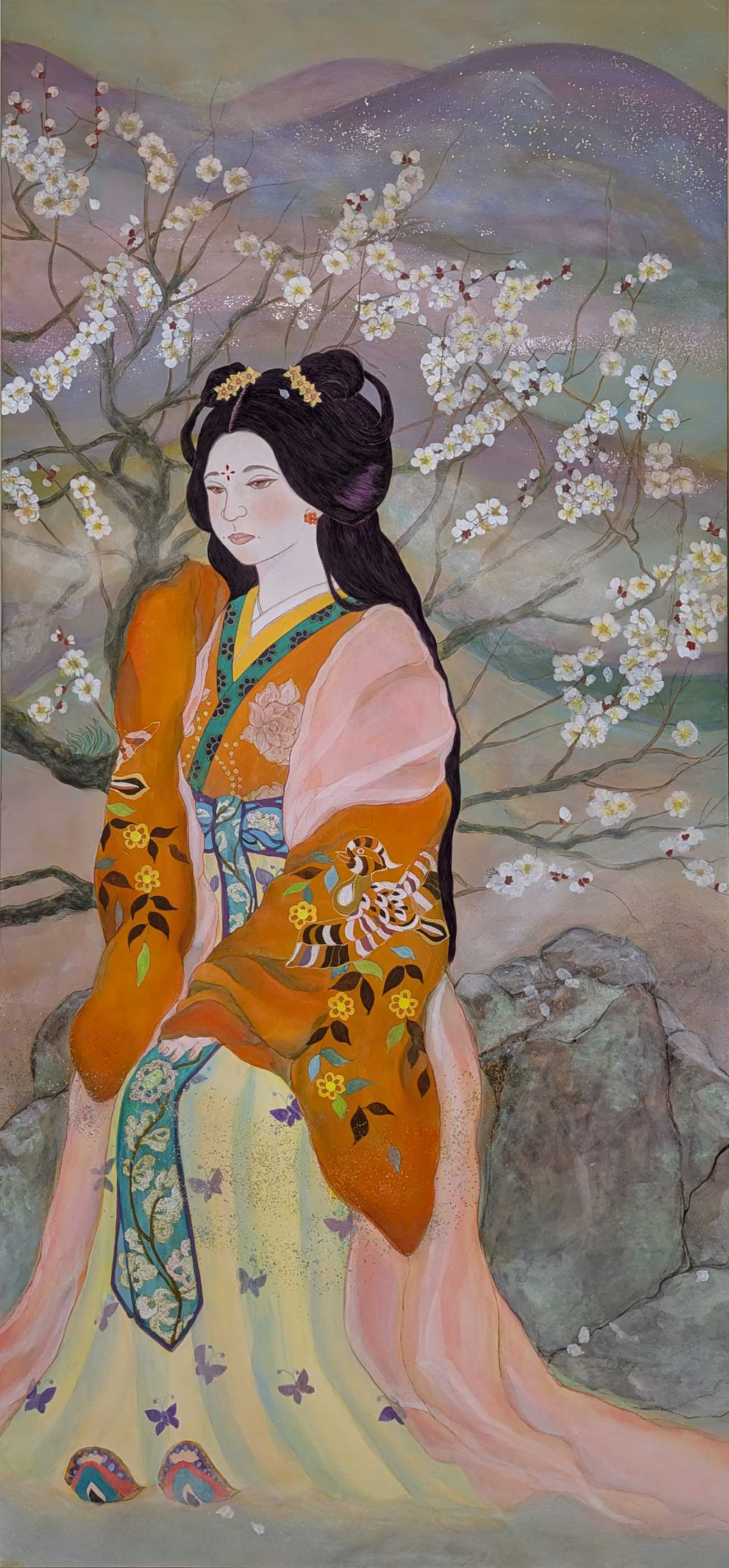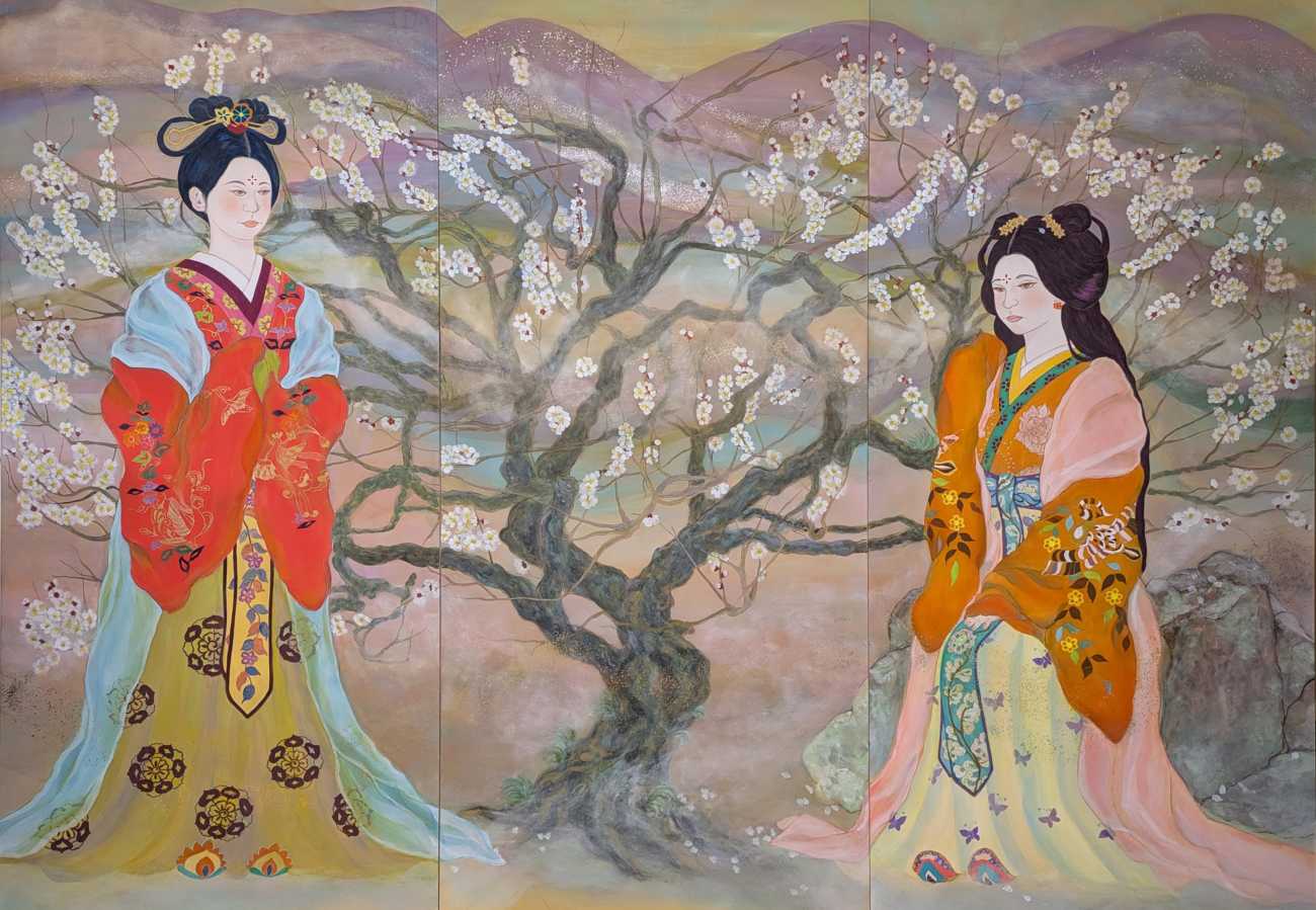 春とは名ばかりの2月、冬を乗り越え今年も咲き誇る満開の梅の花。観賞しているのは、万葉歌人額田王とその娘十市皇女。この後、壬申の乱により悲劇的な対立を余儀なくされる。厳しい宿命を生きた二人の女性に思いをはせて。