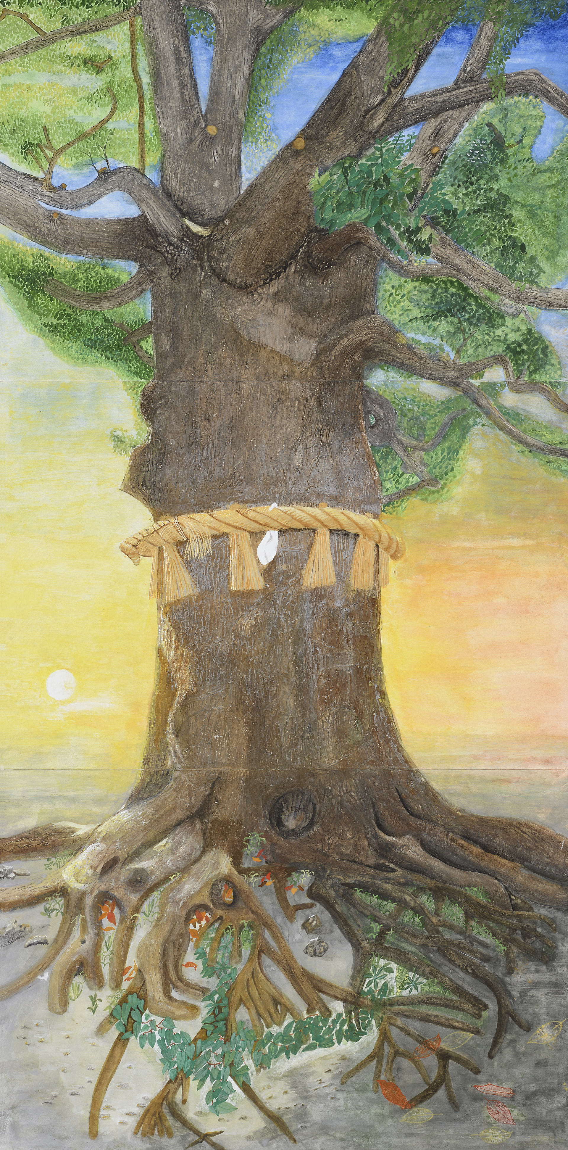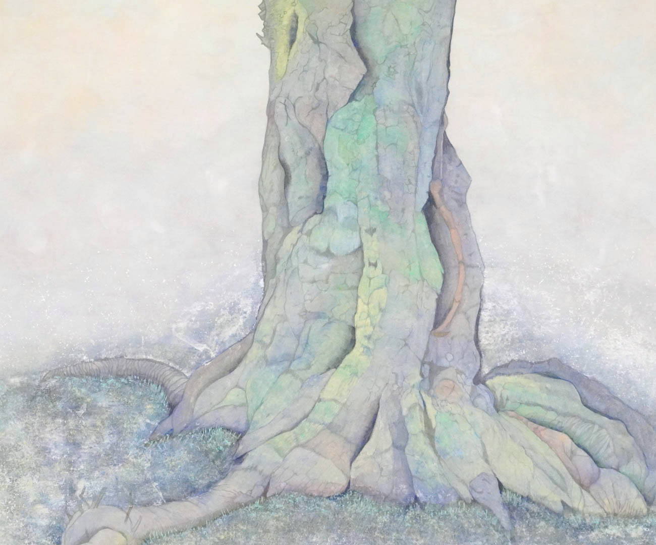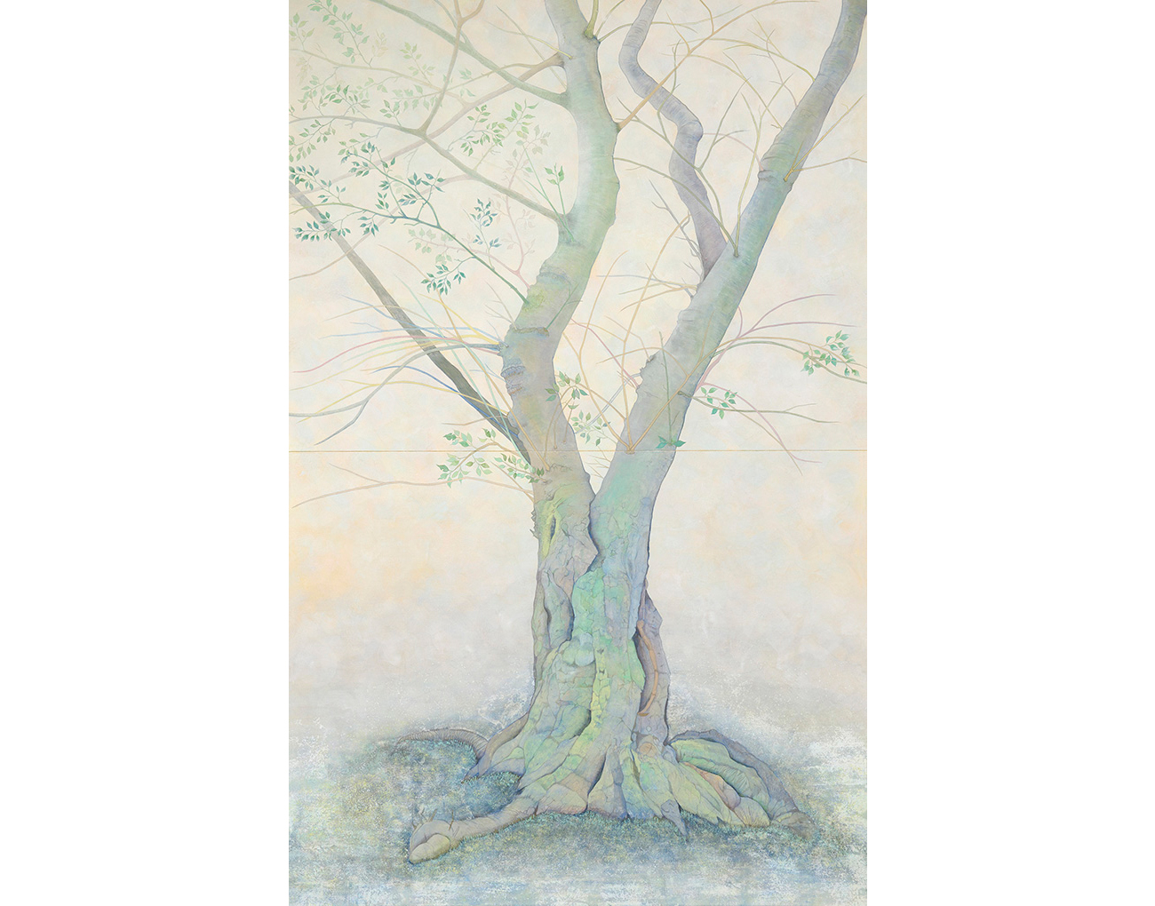 遊歩道の外れ、余花も終わりひっそりと佇む桜をモデルに描きました。日々の写生では、苔むした幹、派生した枝、そこから伸びる若く細い枝、生まれたての葉、皆が一身に太陽の光を求め動き、協力しながら成長する時間を感じずにはいられませんでした。この共生の姿こそ植物の美しさの根源ではないか、と気づいたときの感動は忘れられません。