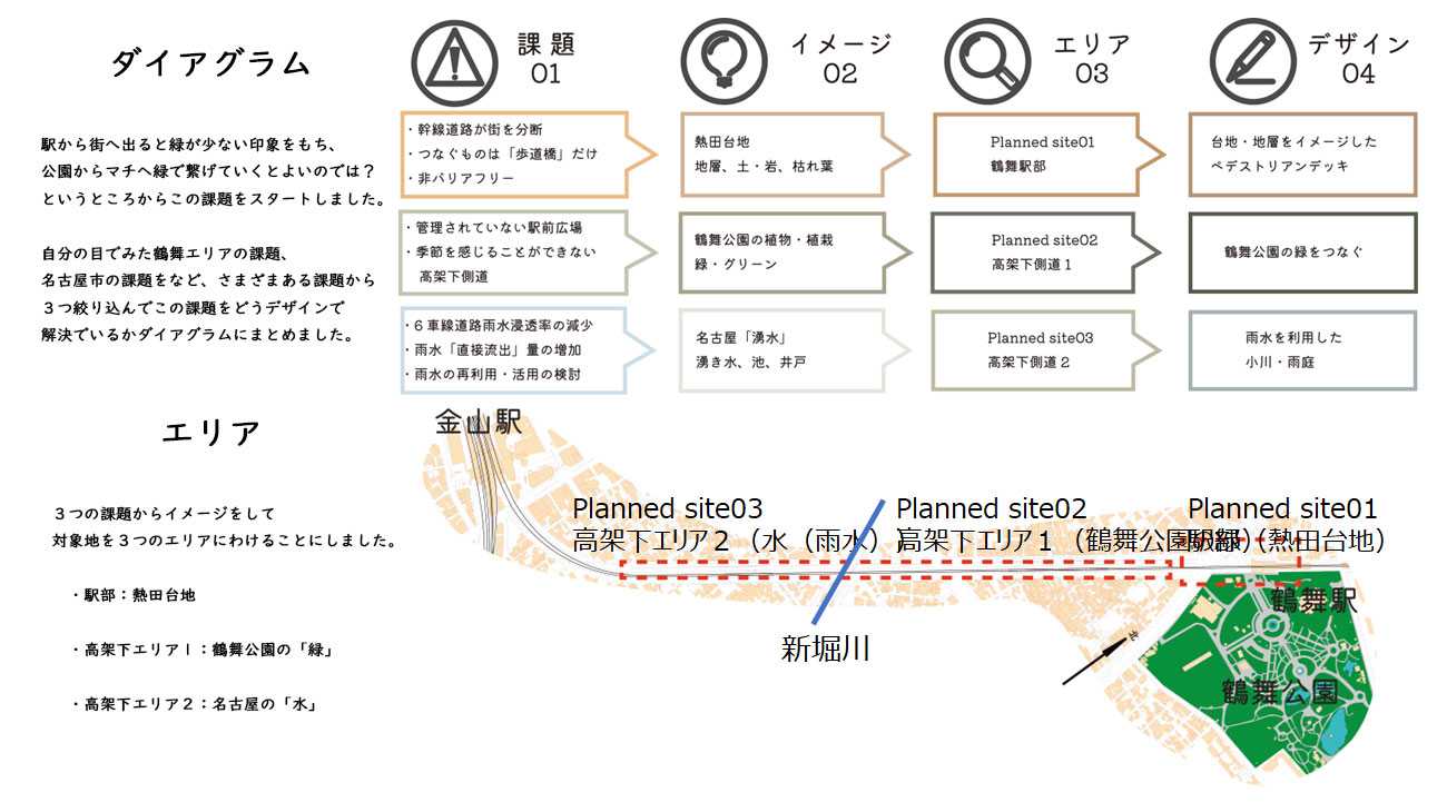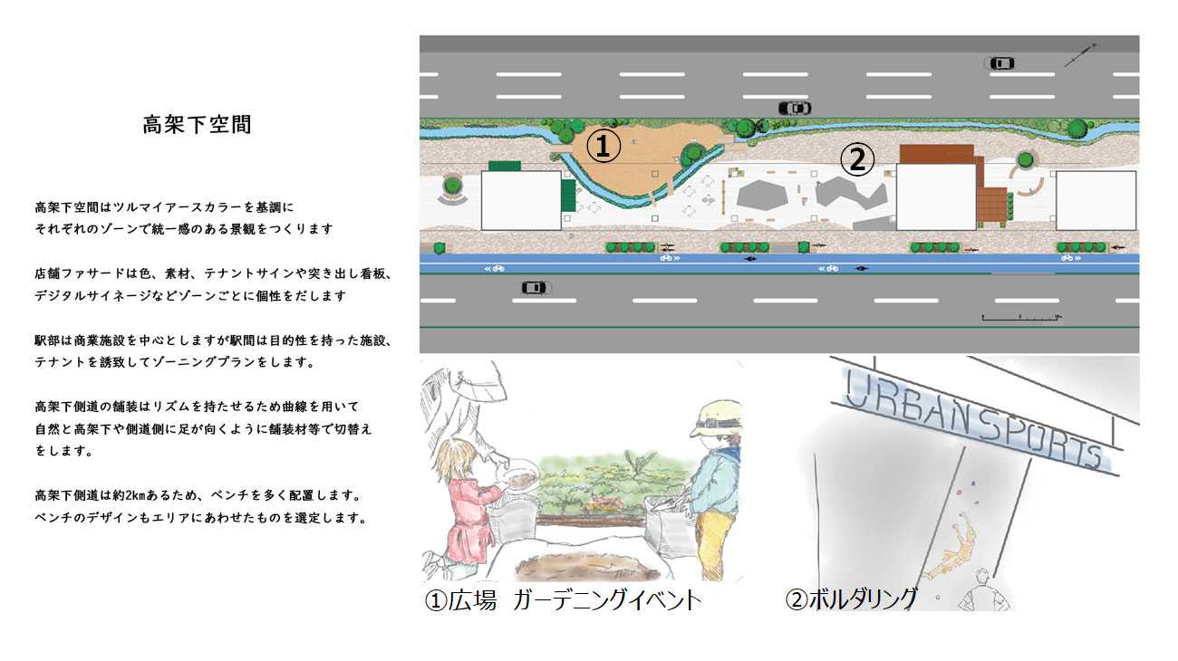鶴舞公園は、日比谷公園を設計した本多静六さんが設計した公園でとても緑豊かな公園です。公園から街へ出ると6車線もある幹線道路、上を見上げると高速道路、オフィスビルなど緑地帯はほぼありません。鉄道高架は古く、高架下店舗もほとんど稼働せず夜は暗く人があることはほぼないエリアです。
