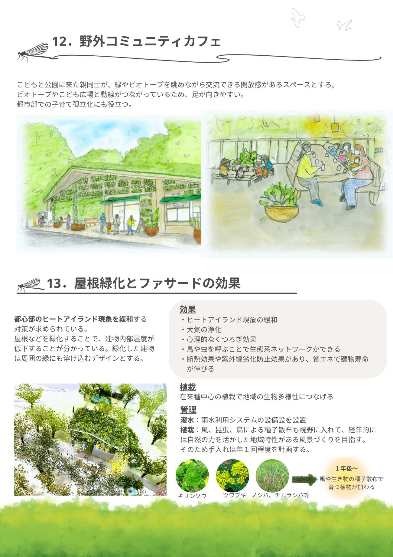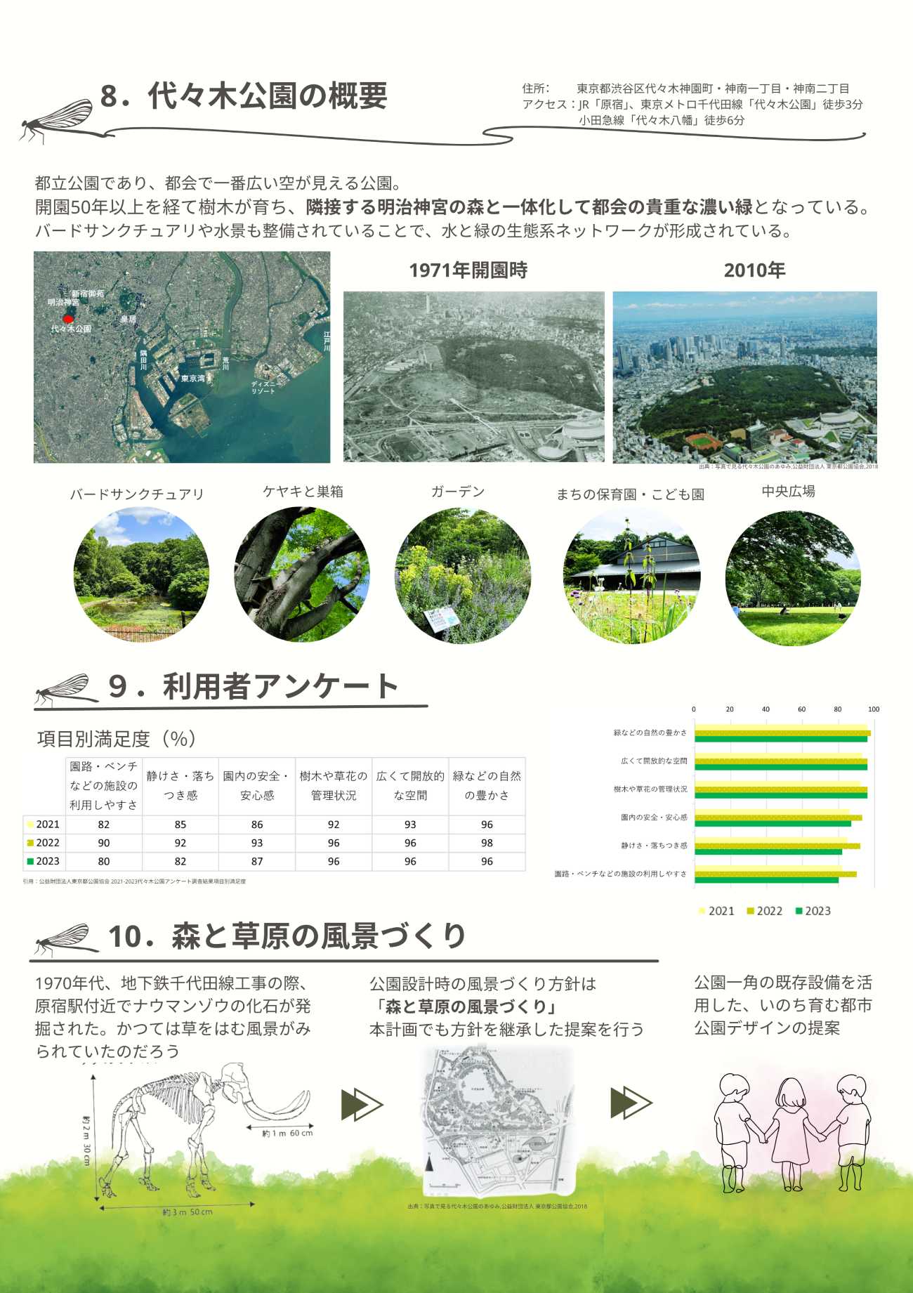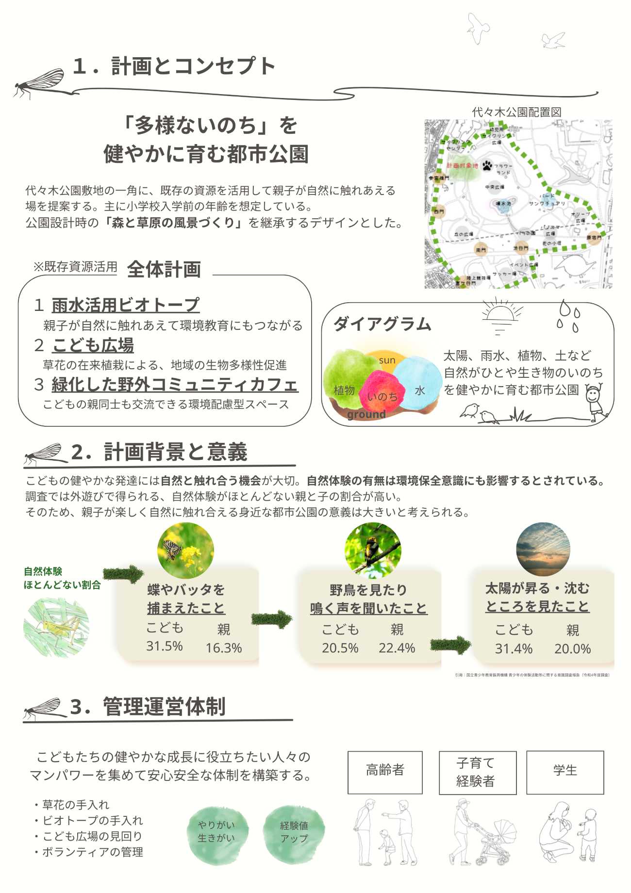 いのちの多様性が大切にされるいま、都心部に位置する明治神宮から続く緑や生態系とのつながりを持つ、豊かなポテンシャルがある代々木公園の既存資源を活用して、こども・おとな・生きもののいのちを育む、柔らかなランドスケープを提案したい。