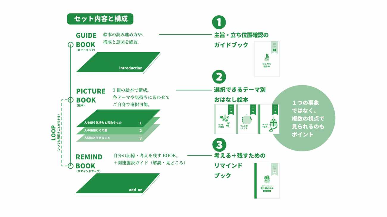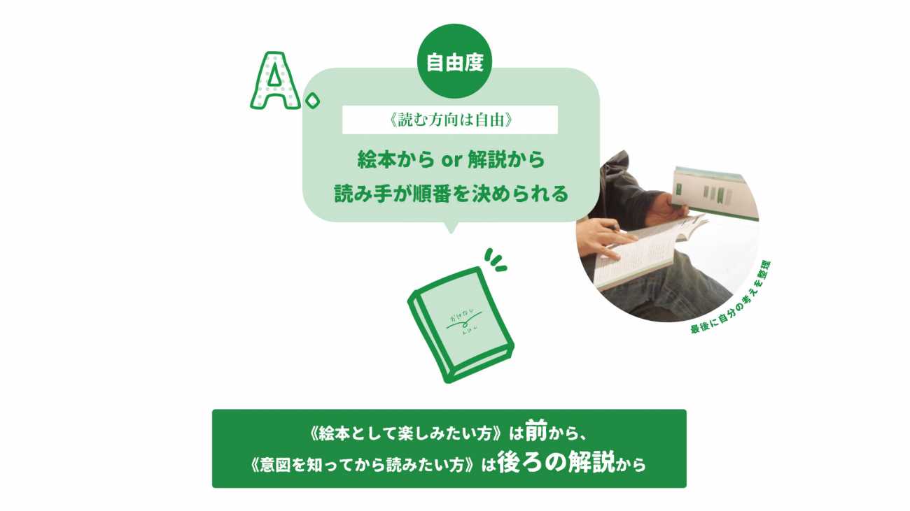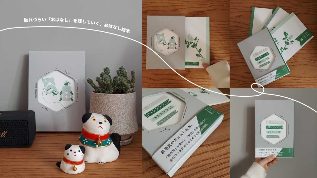 「触れづらいことへの心理的・物理的な距離を近づけること」を研究のメインテーマとし、印象調査や試読などブラッシュアップを重ね、現在のアウトプット作品となりました。距離を近づけるためには《考える》《リンクする》の2点が重要と考え、インタビューに伴う絵本だけでなく、現代とリンクする部分や自分の考えをまとめる工夫も盛り込み、卒業制作では絵本セットとして表現しました。