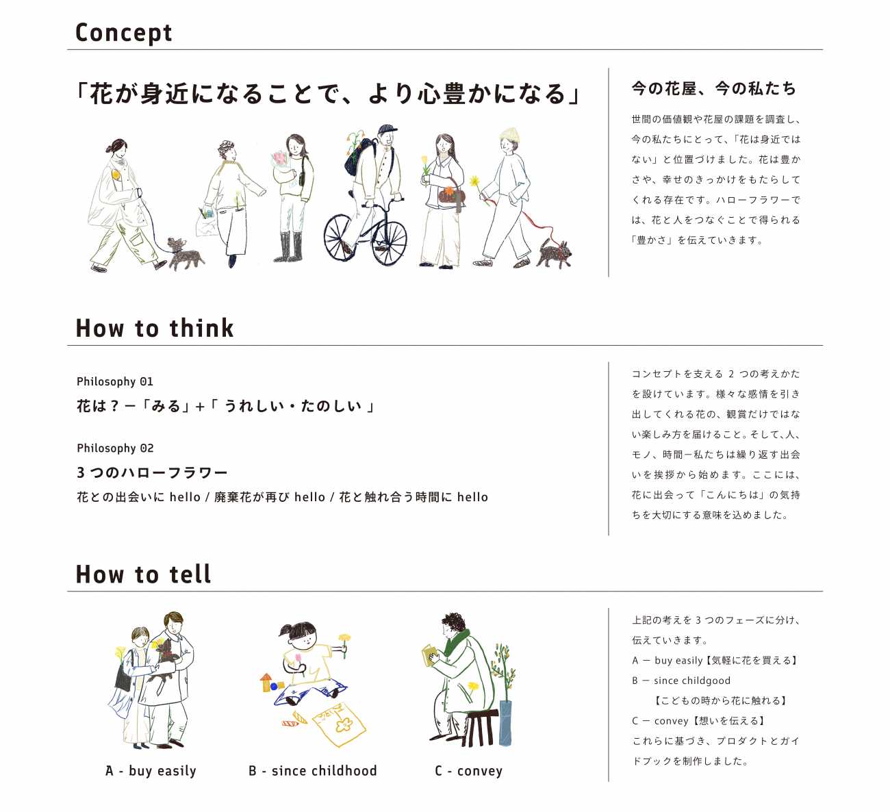 「花が身近になることで、より心が豊かになる」 これがハローフラワーのコンセプトです。花は豊かさや喜び、幸せのきっかけ。そんな花とのかかわり方を提案するにあたり、2つの考えを大切にしました。 そして、[1/気軽に花を帰る 2/こどもの時から花に触れる 3/ハローフラワーの想いを伝える]の3つのフェーズに分け、プロダクトを展開しています。