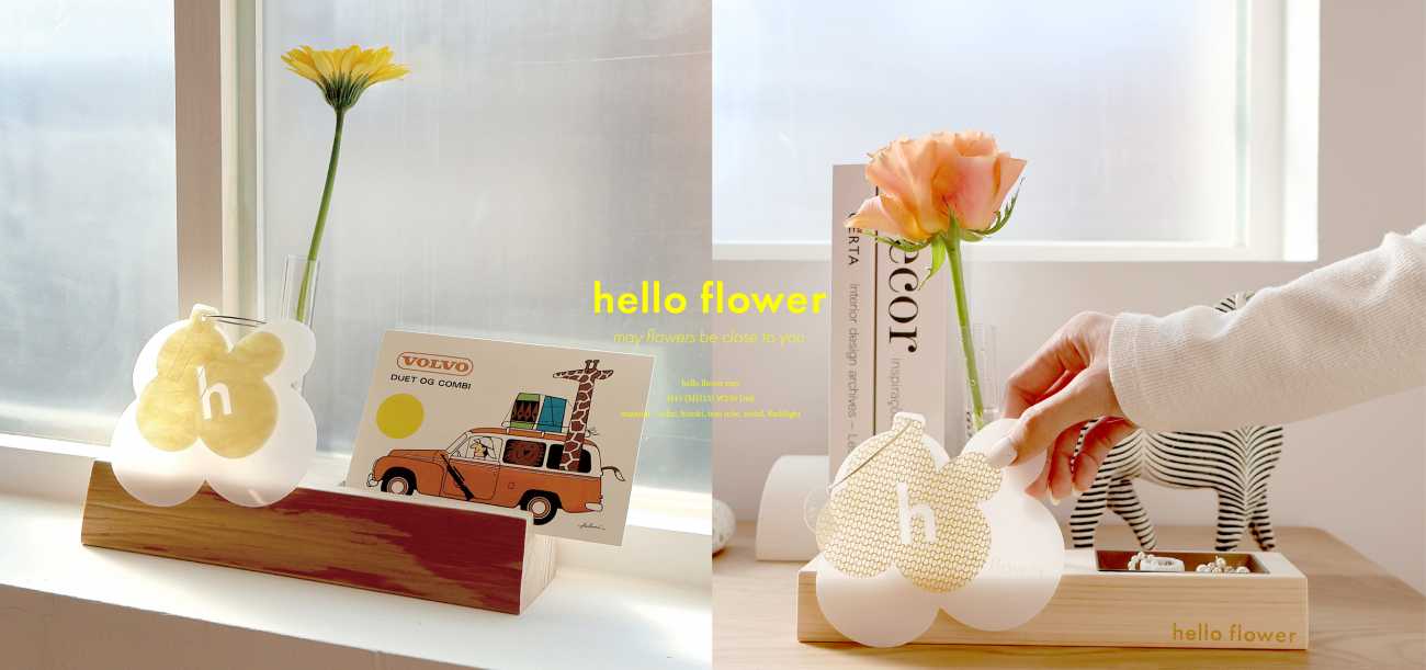上記で紹介したアクリル製のキーホルダーと、一輪の帰る場所として、お家で楽しめるトレーを制作。キーホルダー置き/自宅用の花挿し/アクセサリートレーまたはCDやポストカードを飾るディスプレイとしてお使いいただけます。温かみのある木材のトレーの穴へ、キーホルダーの保水キャップをさすことで留まる仕組みです。また夜には、「おやすみフラワー」として、花影を映し出せるよう、トレーには小さなライトを内臓。花をいろんな角度からお楽しみいただけます。