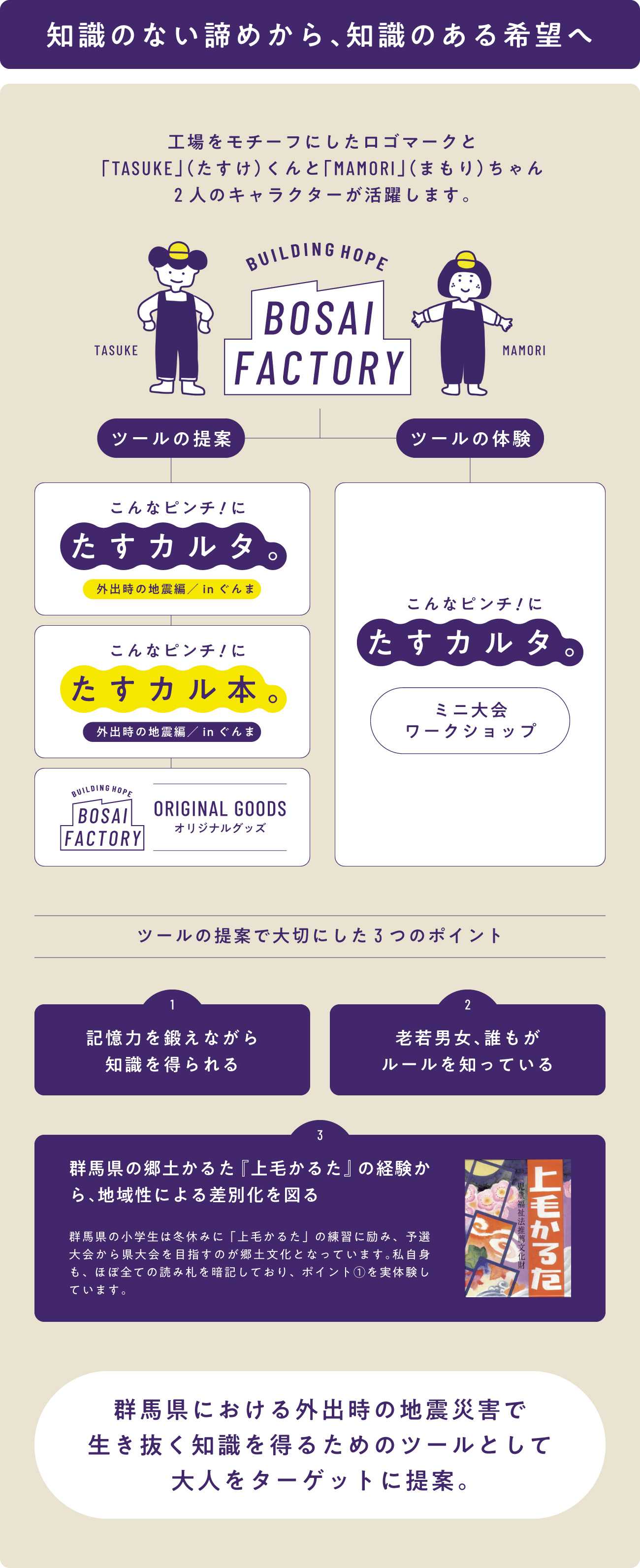 そこで誕生したのが、地震災害を生き抜く知識を得るためのツールを提案する