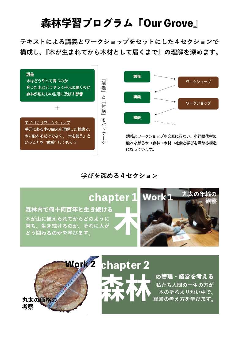 プログラムはテキストによる講義とワークショップをセットにした4セクションで構成し、『木が生まれてから木材として届くまで』の理解を深めます。