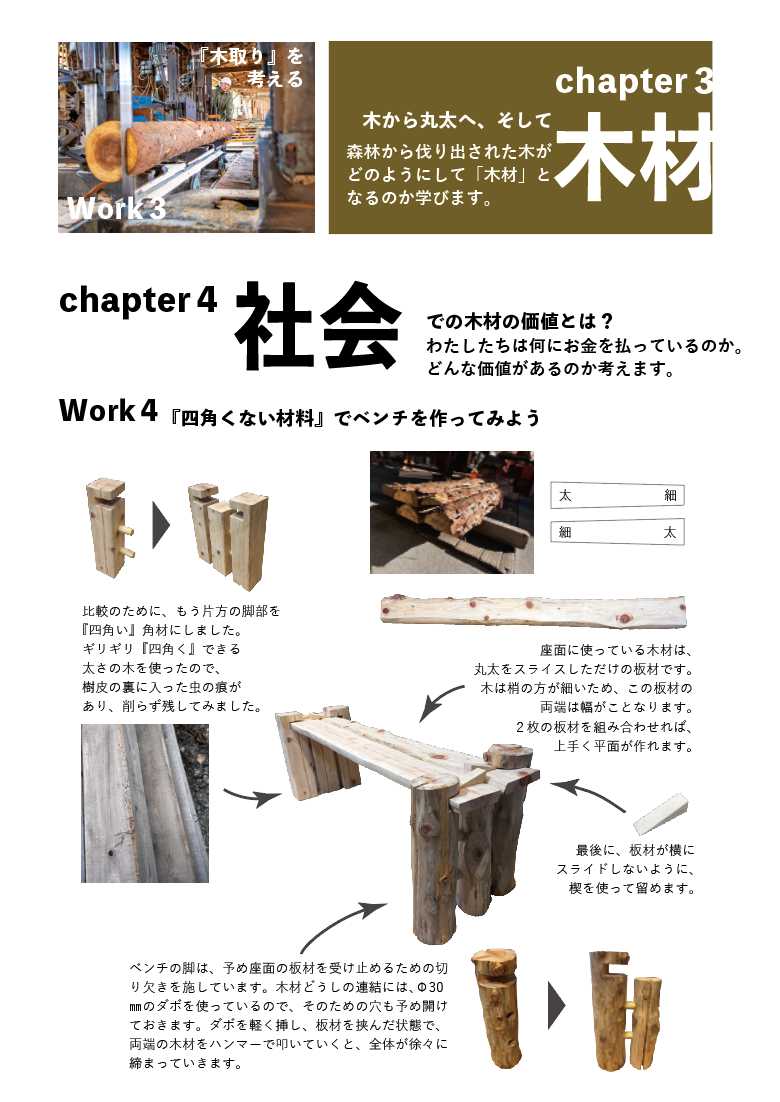 プログラム中のWork4で、参加者に『四角くない木材』でベンチを作ってもらいます。『四角く』なくても使える木材、『四角い』ことによる扱いやすさ、『四角くする』ことによって捨てられる間伐材。それらを照らし合わせて、自分にとっての“木材の価値”を見つめ直してもらえればと考えます。