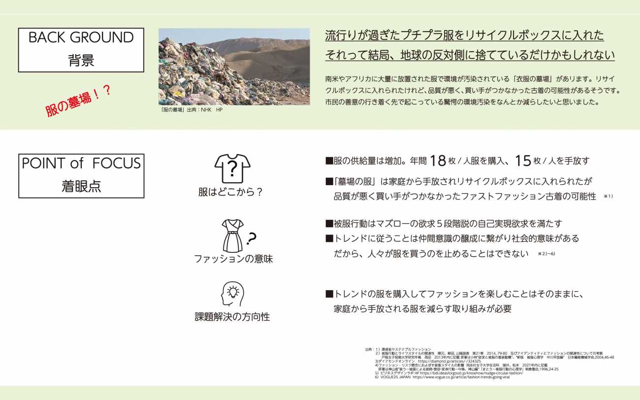 だから、トレンド服を購入してファッションを楽しむことはそのままに、家庭から手放される服を減らすことが大切だと考えました。