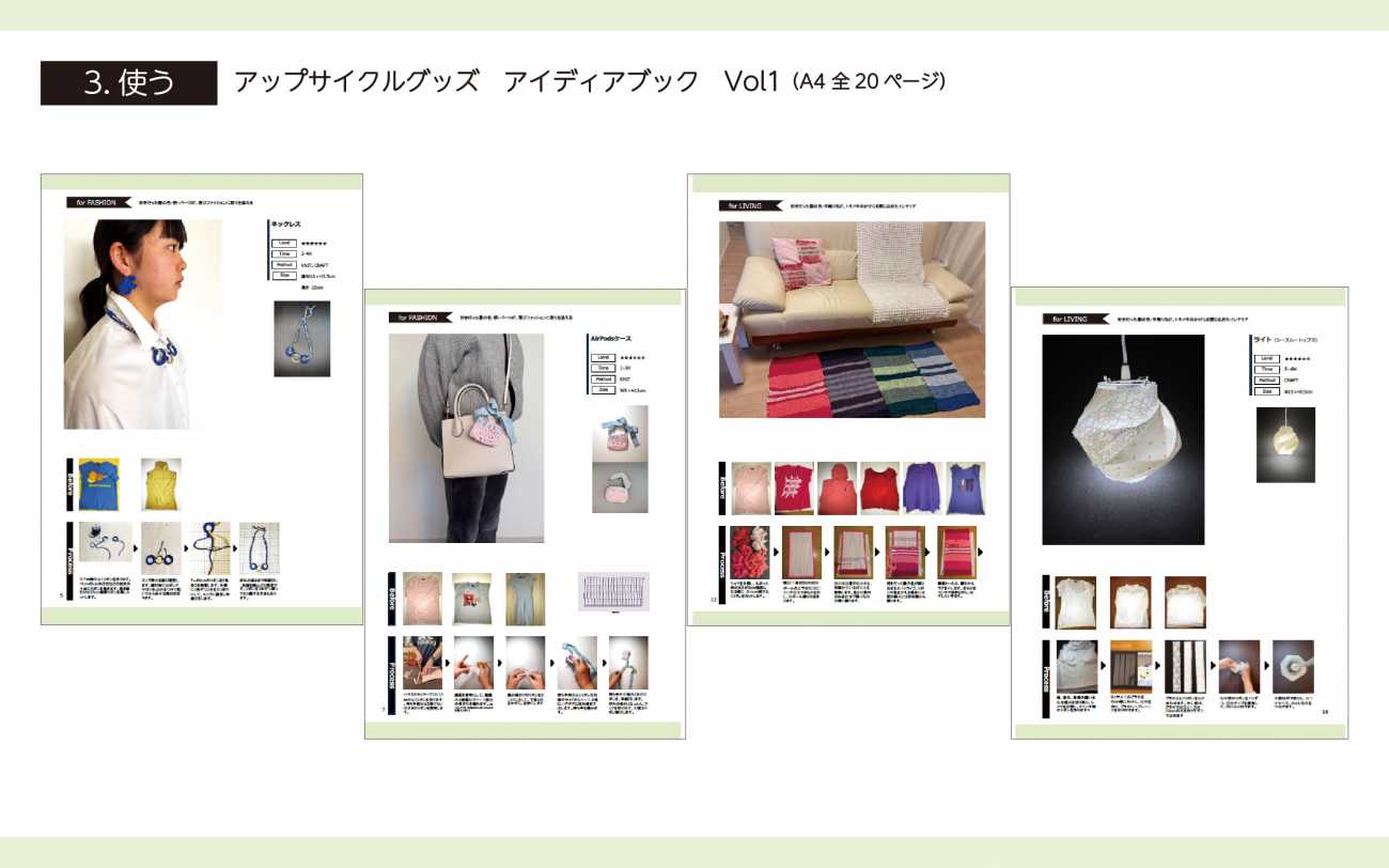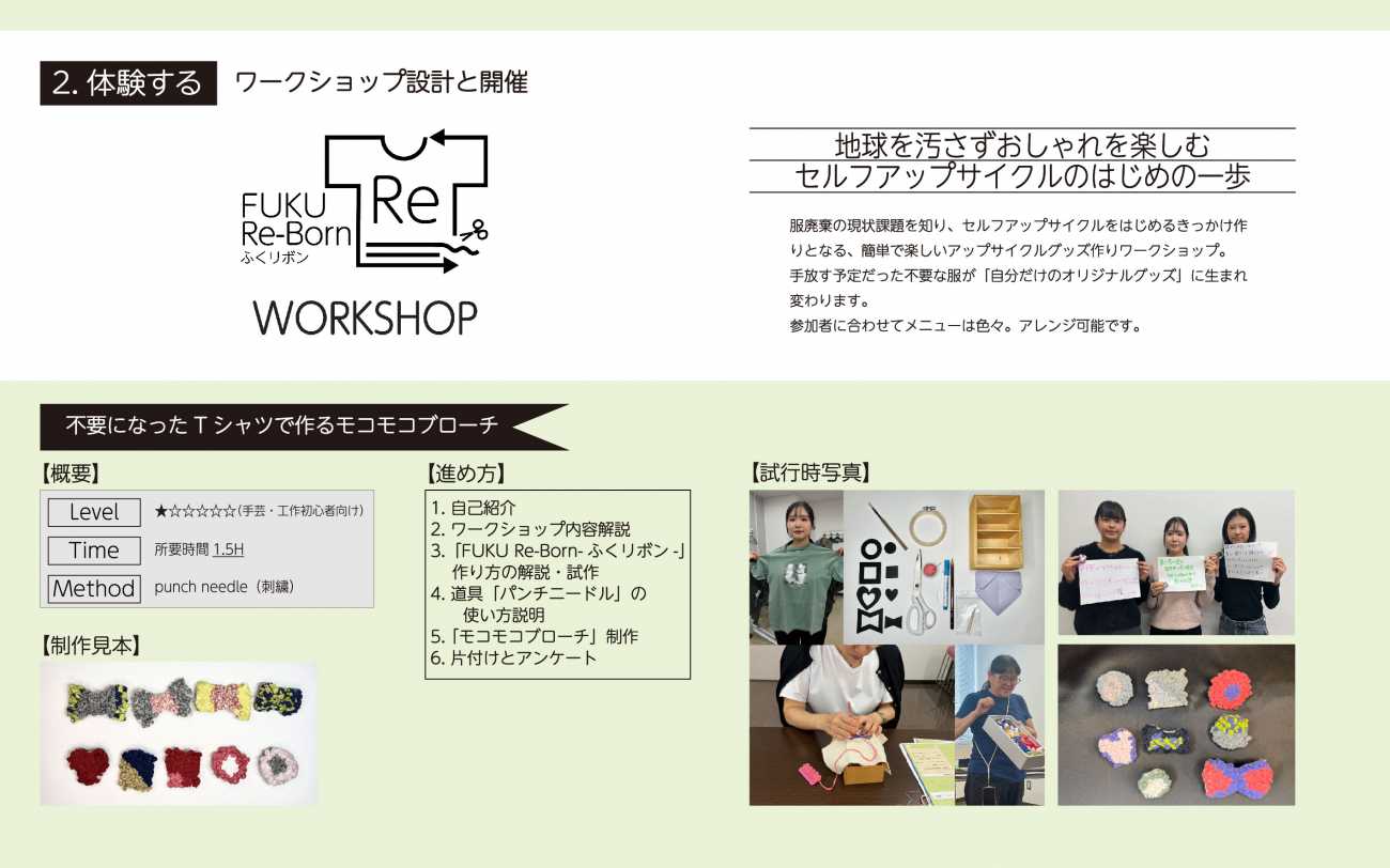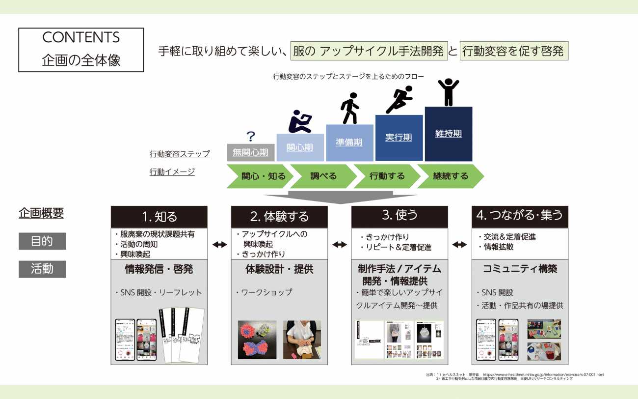 服廃棄の現状課題を知ってもらい、地球を汚さずにオシャレを楽しむ方法をワークショップで体験してもらい、裁縫の知識や特別な道具がなくても、手軽で楽しくて、やってみたくなる様なアップサイクル事例を多数開発。SNSなどの情報提供&交流促進ツールも作成しました。