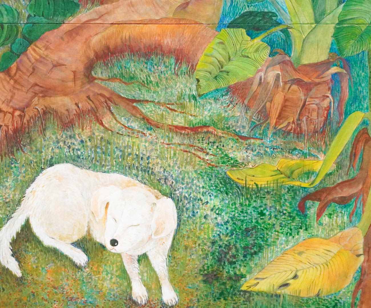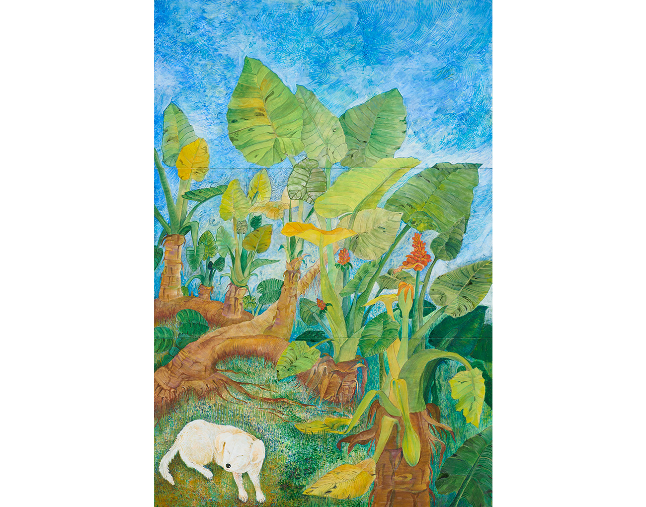 我が家の庭に、どこからともなくやってきた「くわずいも」。勝手に根をおろし、小さな庭を支配している。根っこをのこぎりで切っても、いつの間にか我がもの顔で成長し続けている。困ったものだとおもいつつ、その大きな葉の下で我が家の家族の一員である犬のジョーンズがくつろいで居眠りをしている。
