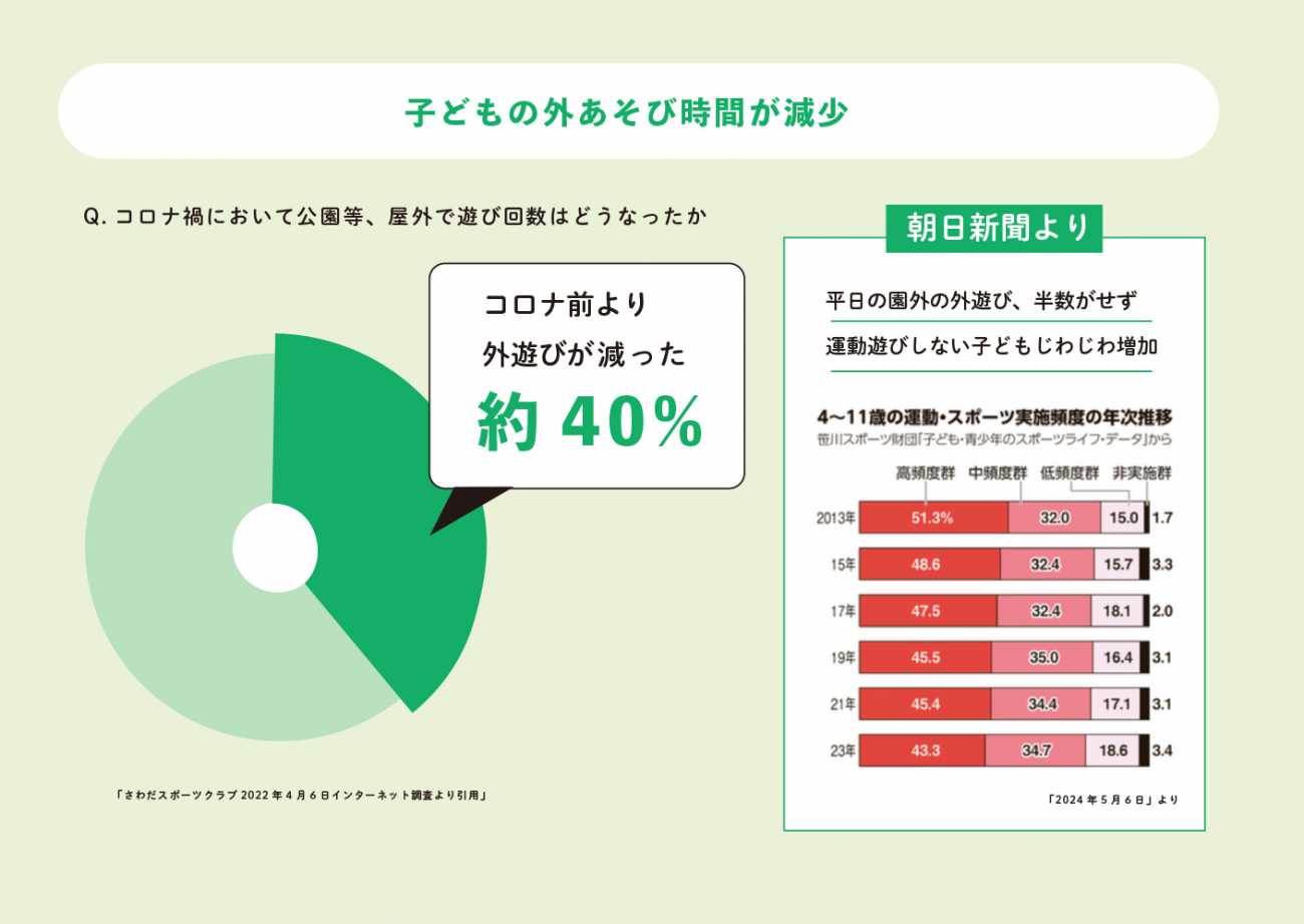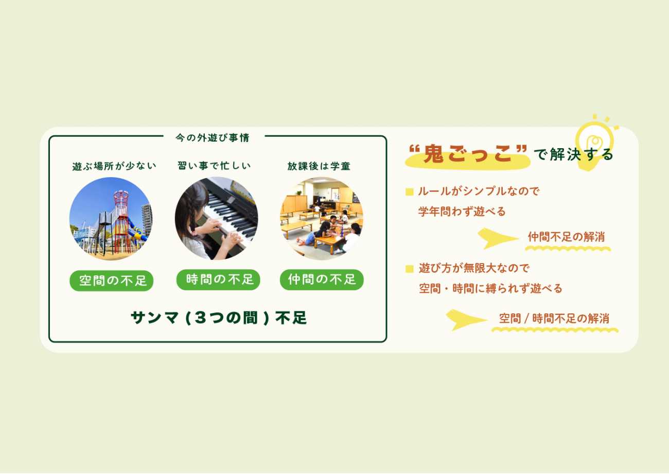 今子どもたちの外遊び時間が減少し、その原因が空間の不足・時間の不足・仲間の不足=サンマ(3つの「間」)の不足と言われています。限られたサンマの中で、子どもたちが無理なく自由に遊べる外遊びはなんだろうと考えた時、鬼ごっこの着目しました。