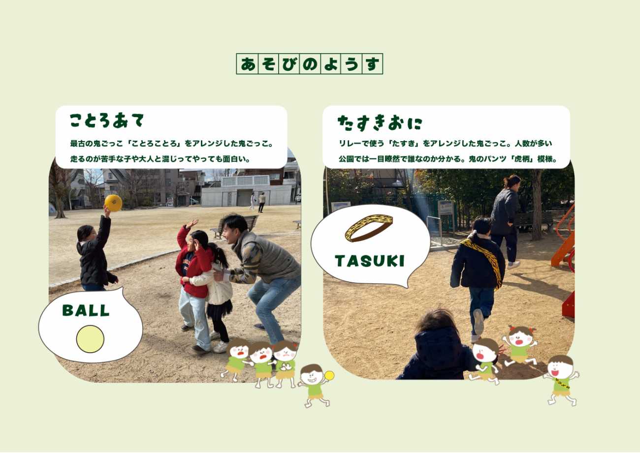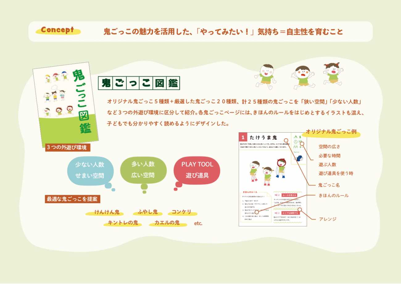 鬼ごっこの魅力や歴史、そして自身で考えたオリジナル鬼ごっこなど様々なシーンで遊べる鬼ごっこを紹介した「鬼ごっこ図鑑」、外で鬼ごっこを遊ぶ時に使える「PlayTool」などを通して、子どもたちが元気よく外で遊ぶ時間が少しでも増えることを目指し制作しました。
