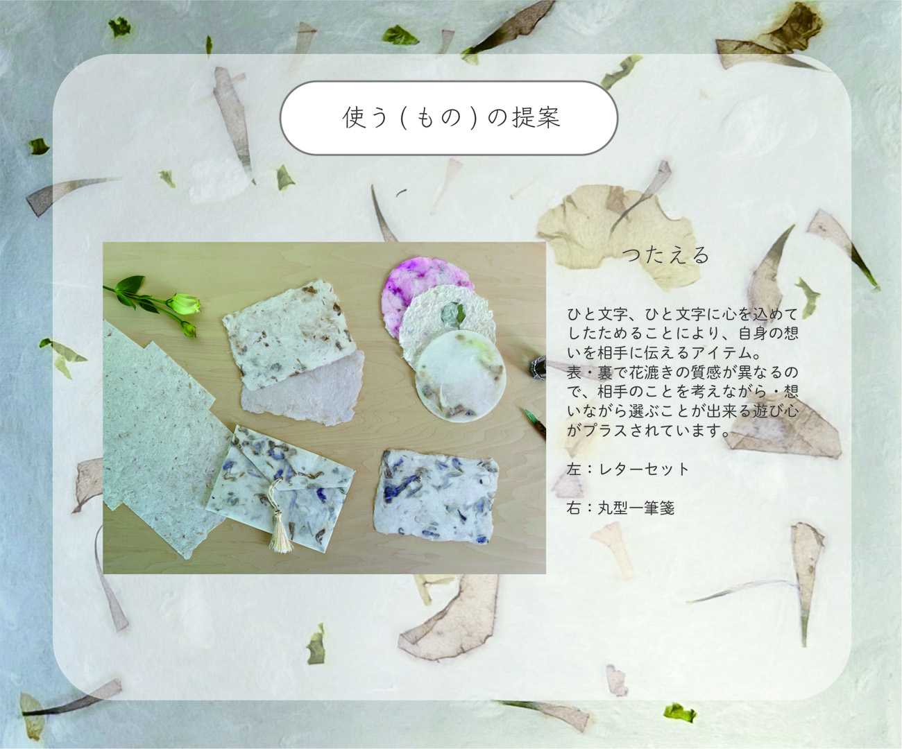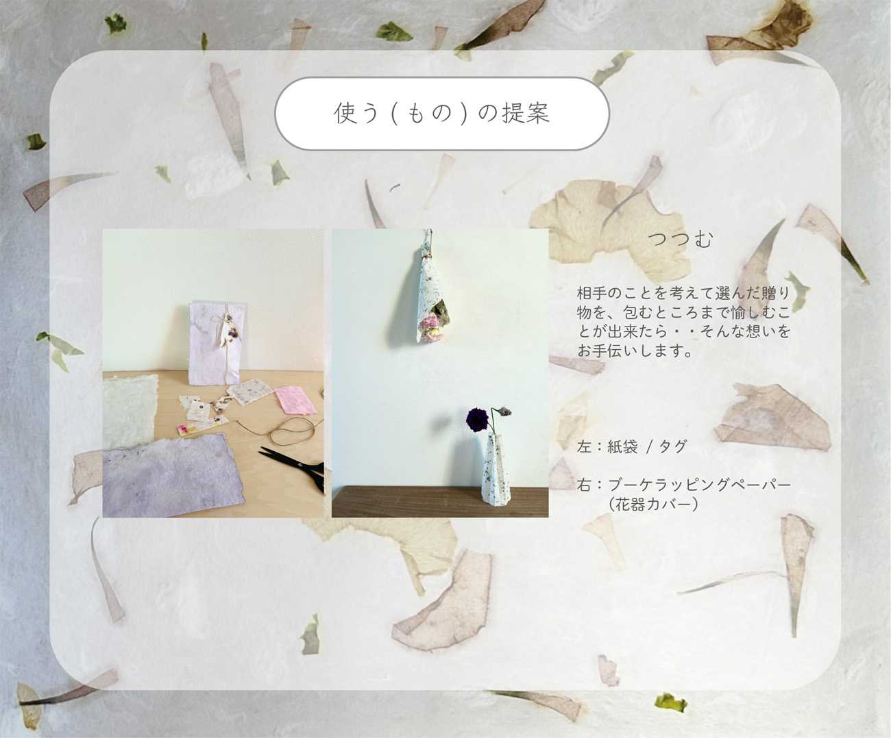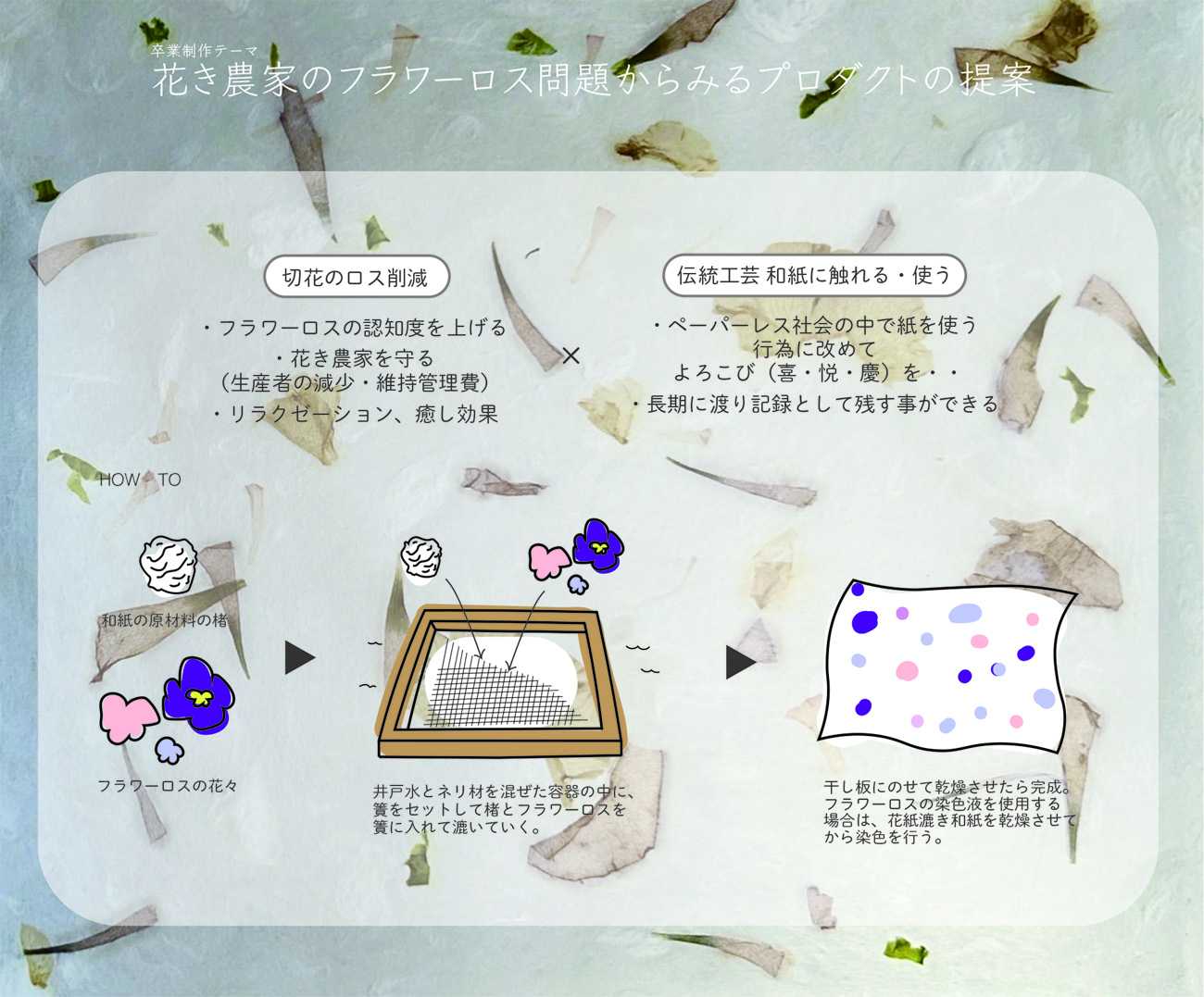花き農家の生産時に出でしまう行き場のない花々を使い、日本の伝統工芸の和紙へ漉き込んだプロダクトの提案をします。
