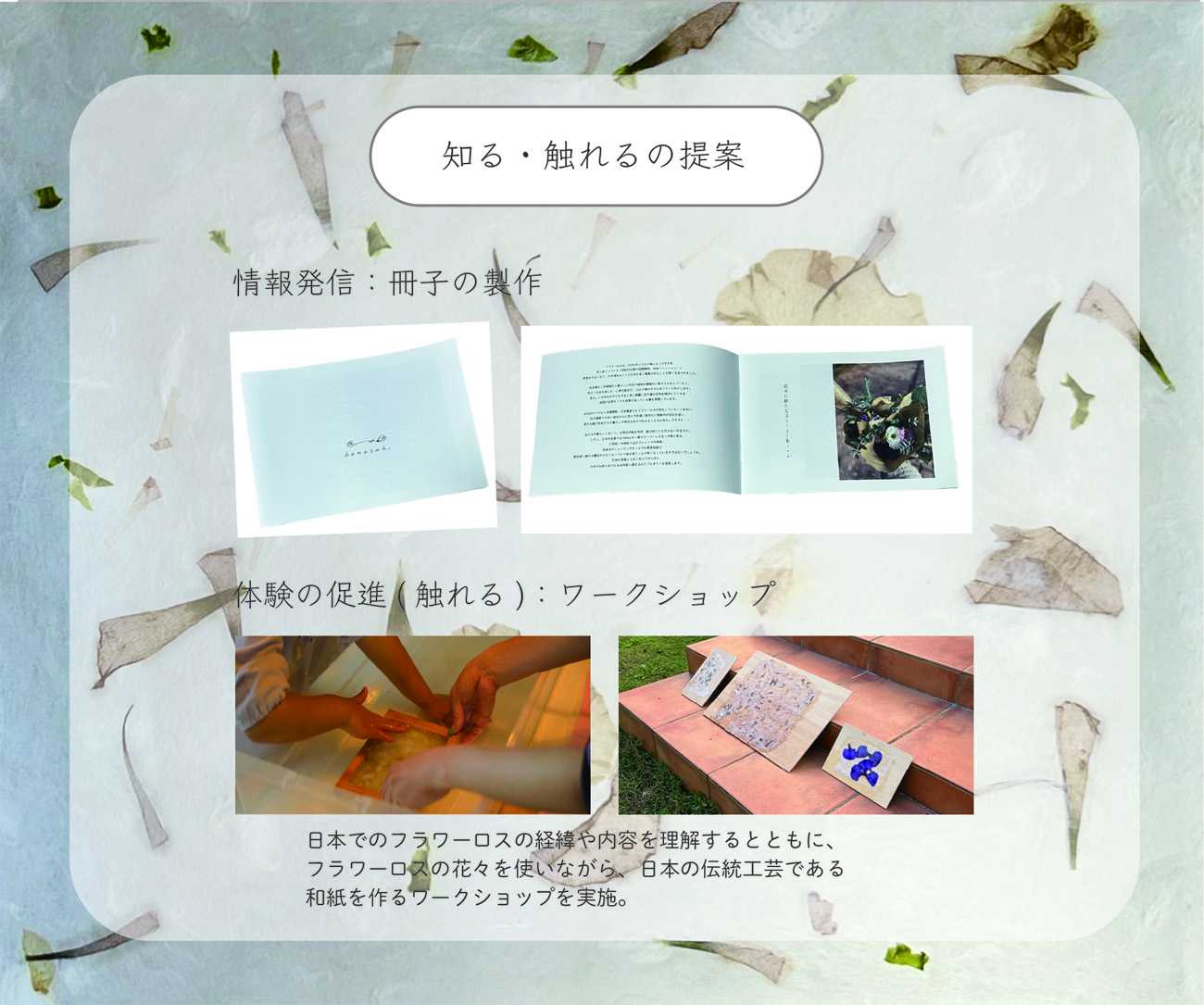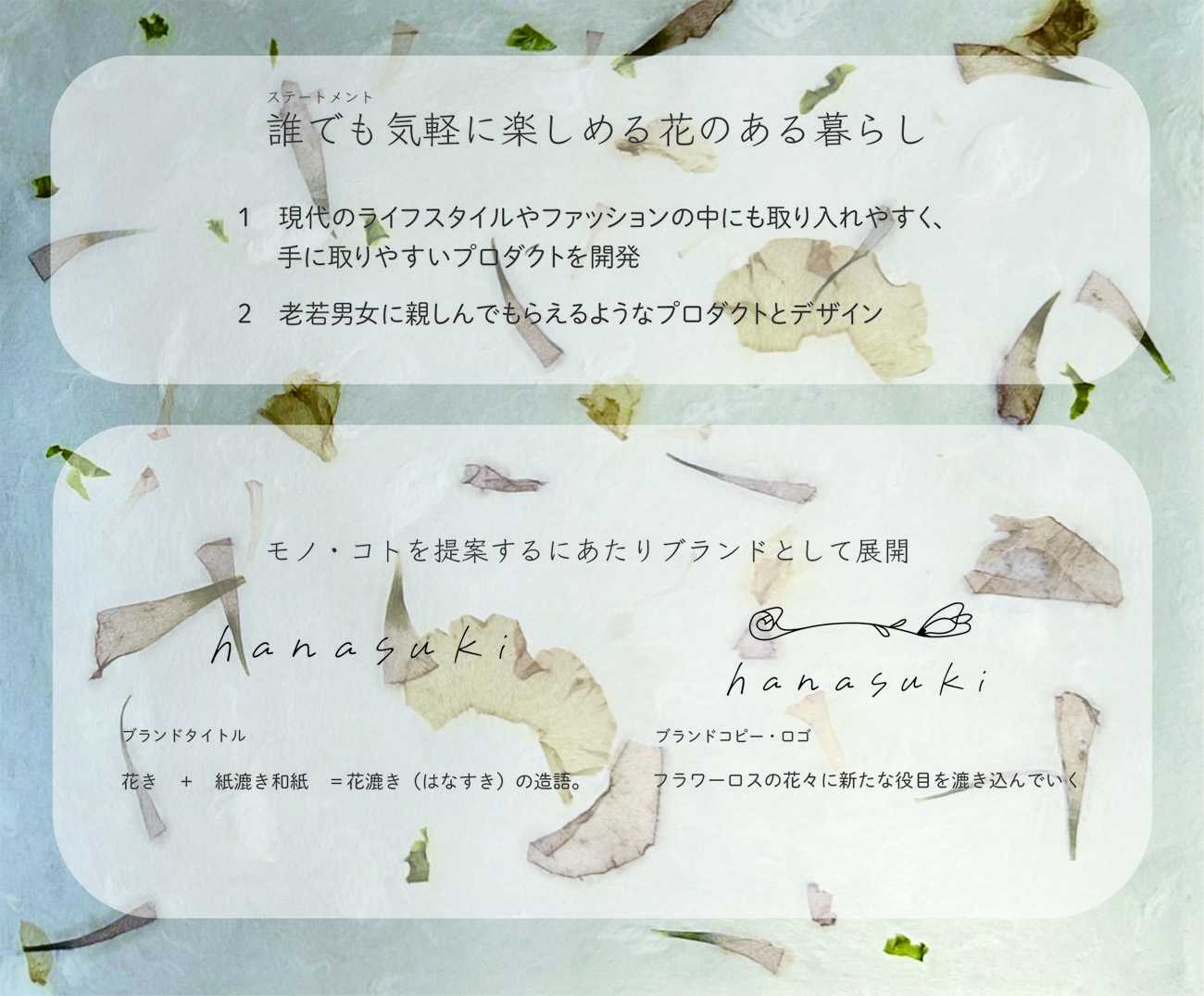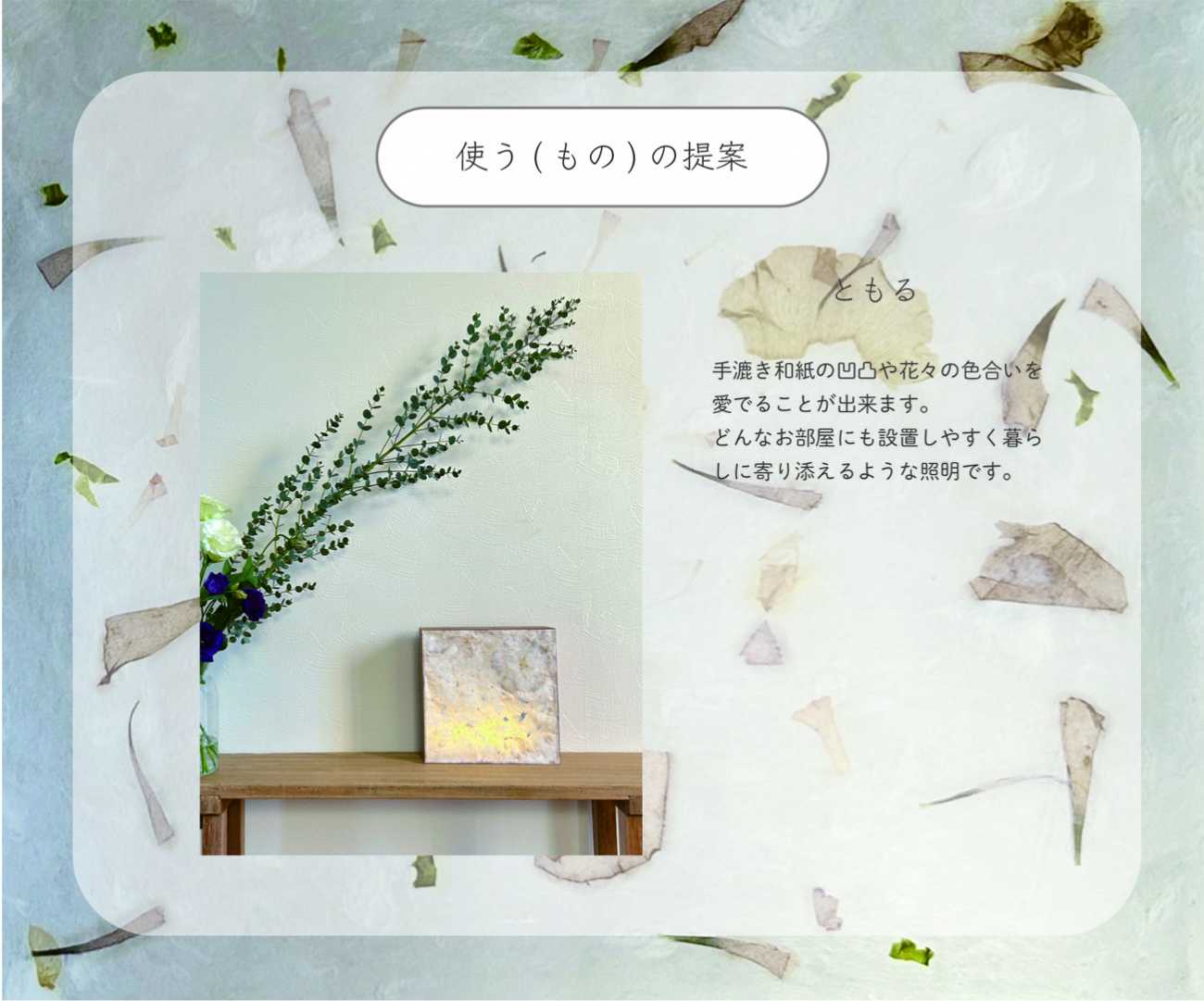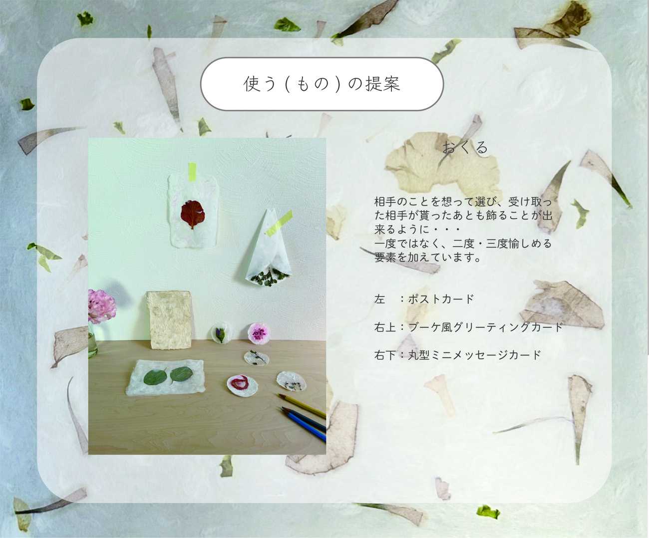 花き農家の生産時に出でしまう行き場のない花々を使い、日本の伝統工芸の和紙へ漉き込んだプロダクトの提案をします。