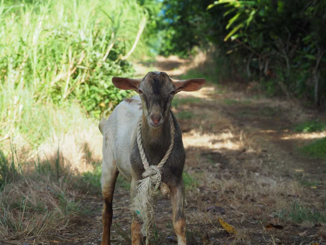 道の真ん中で撮りました。首のロープは繋がっていません。島あるあるです。