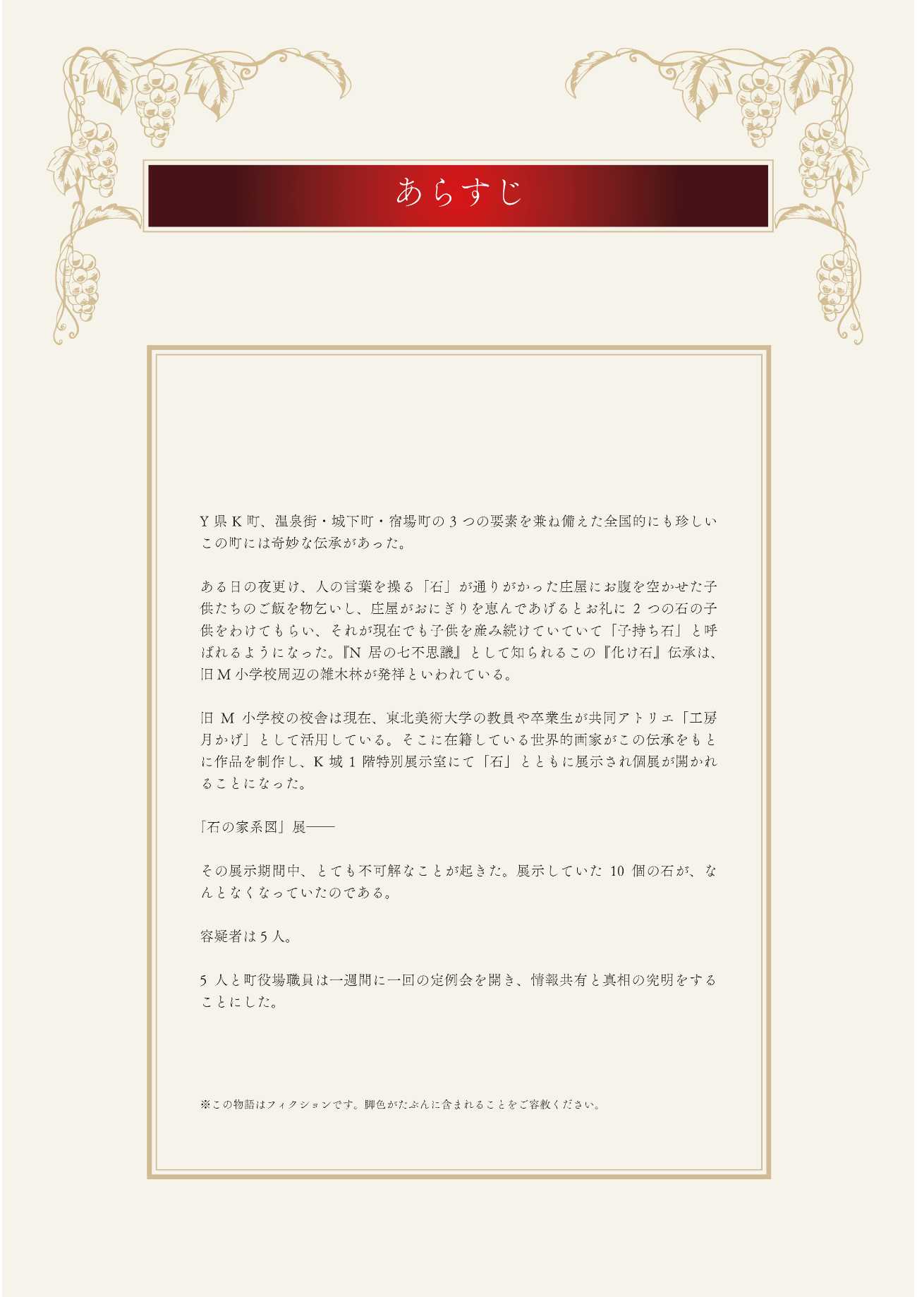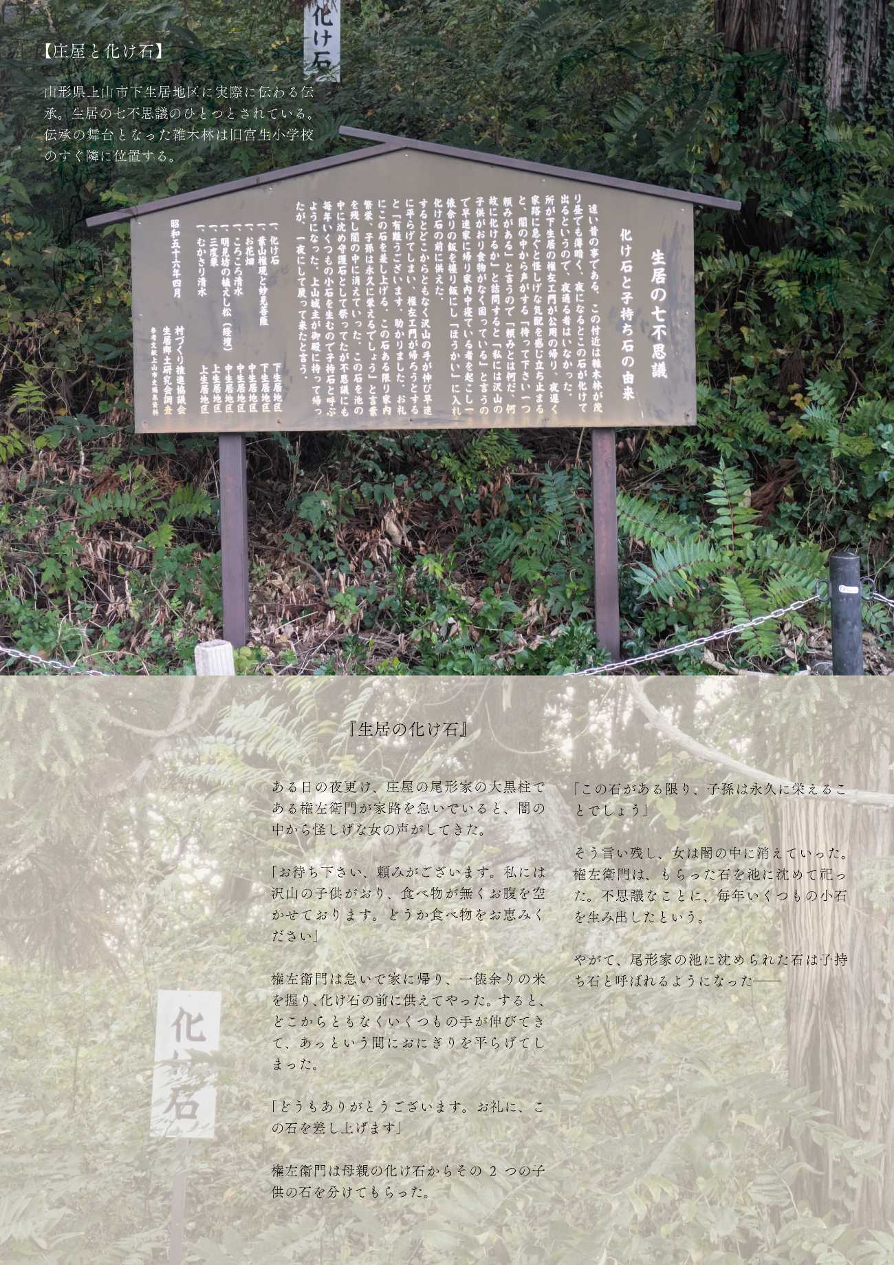 山形県上山市をモチーフにした架空の都市であるY県K町を舞台に、上山市に実際に伝わる「化け石」伝承を取り上げ、マーダーミステリーに落とし込んだエンターテインメント作品。90分のプレイ体験を通してK町にゆかりのある人物たちの生活を追体験し、町の魅力や豆知識、そこで生活する人々の考えや地域の社会課題に触れることができます。事件の真相やいかに!