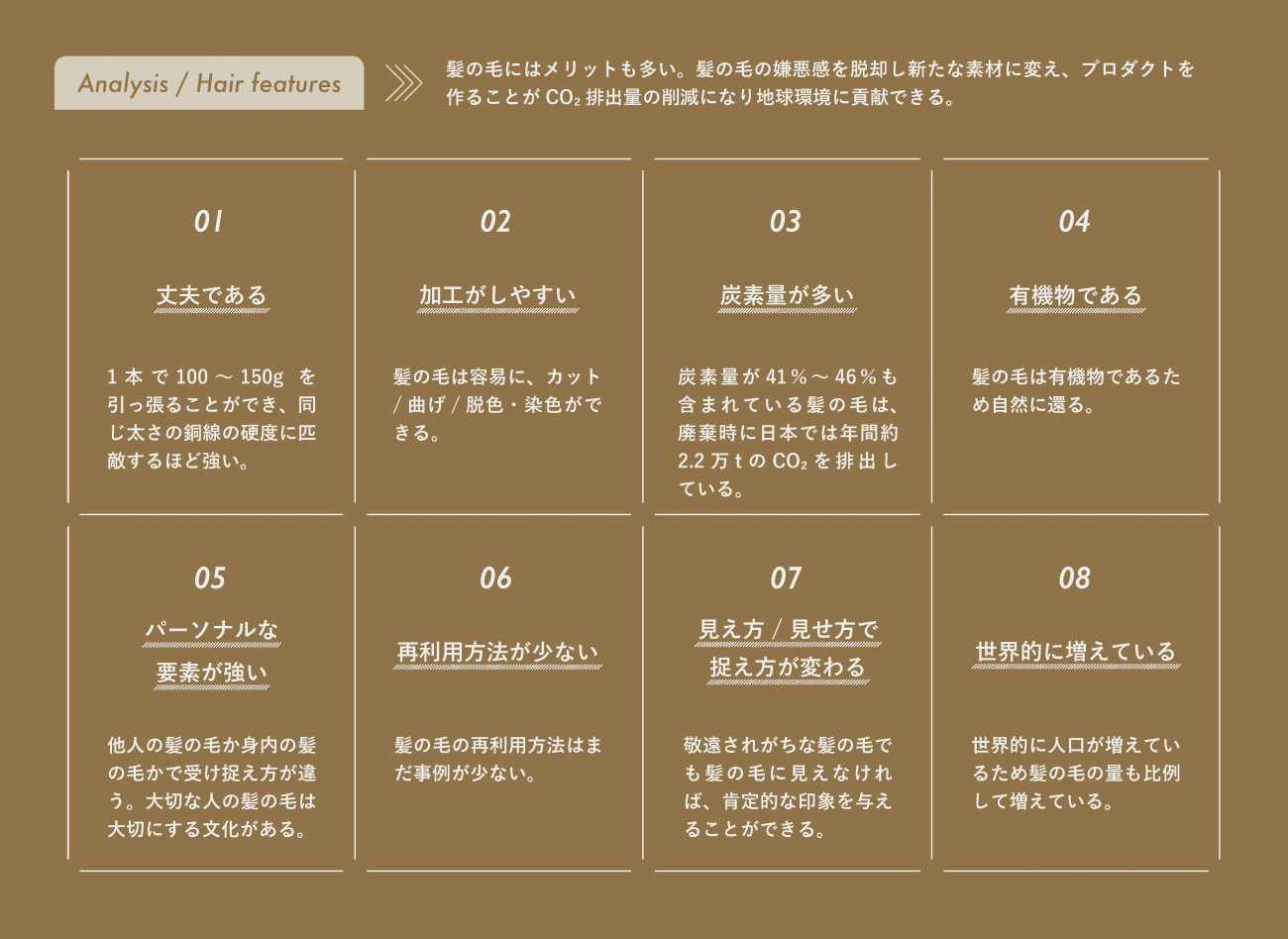 切り落とされた髪の毛は不気味がられる傾向がある。そして日々大量に廃棄されている。しかし、一つの素材として見つめ直した時、様々な特徴があり日常生活に役立つ可能性を感じた。