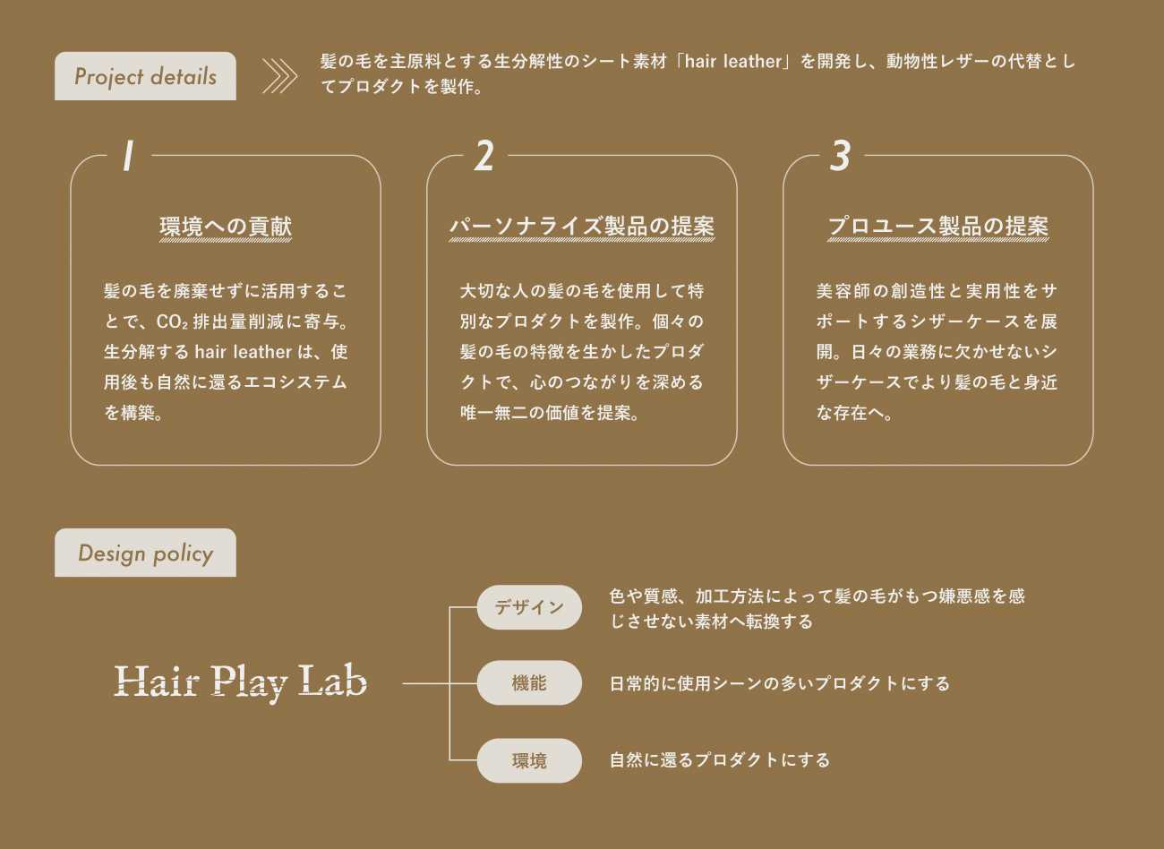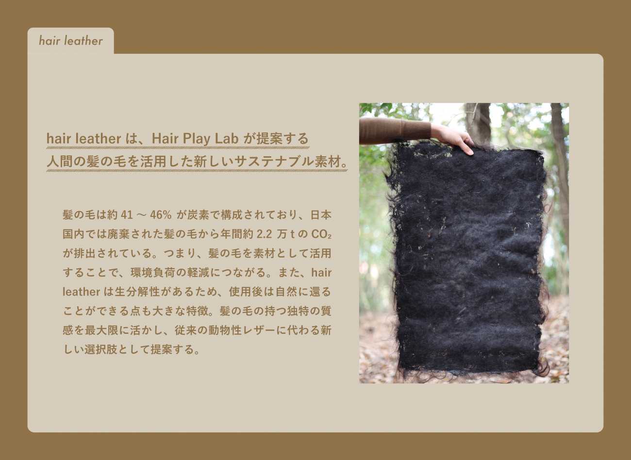 髪の毛の特徴を活かし、髪の毛を主原料とした生分解性のシート状素材【hair leather】の開発とそれを基にプロダクトを製作。 プロダクトは、環境への貢献・パーソナライズ製品の提案・プロユース製品の提案の3つの軸で製作し、デザイン方針としてデザイン性・機能性・環境配慮を意識して取り組む。