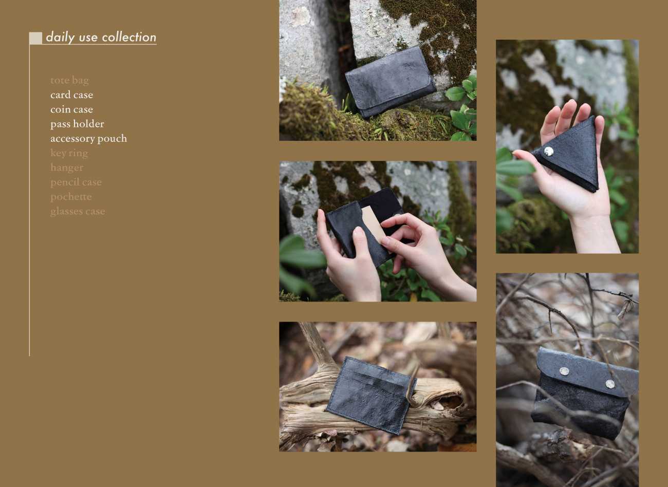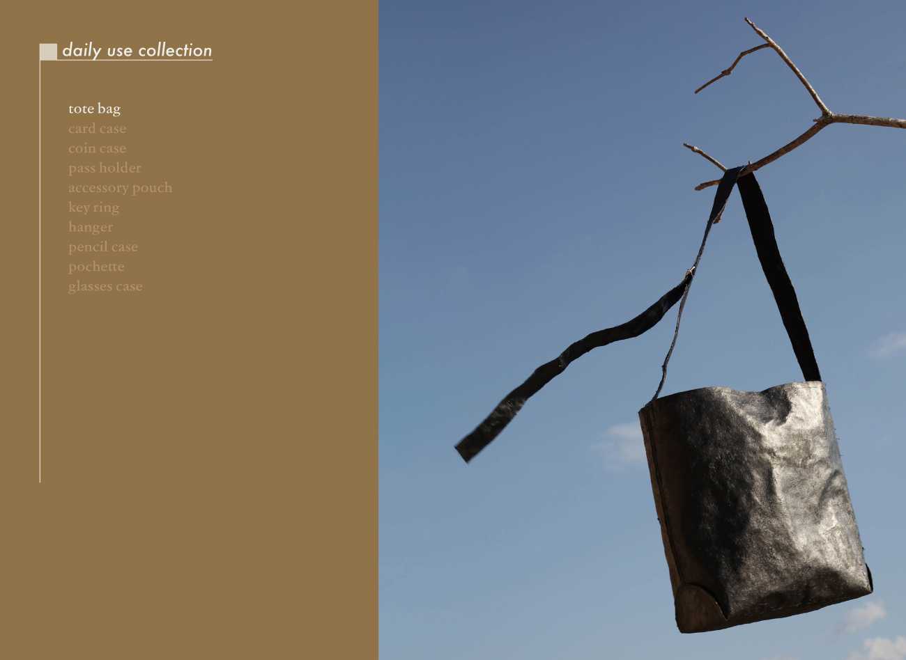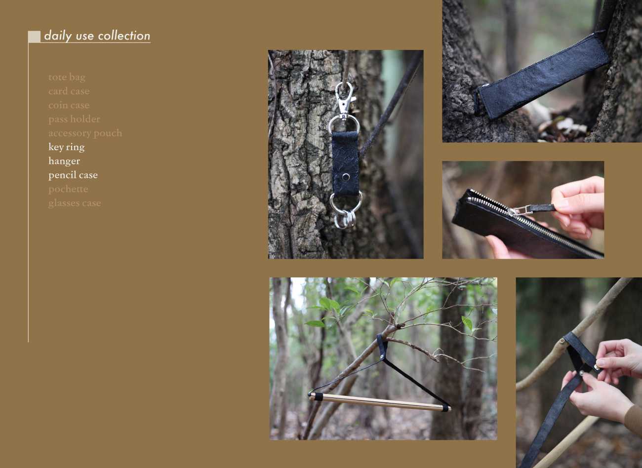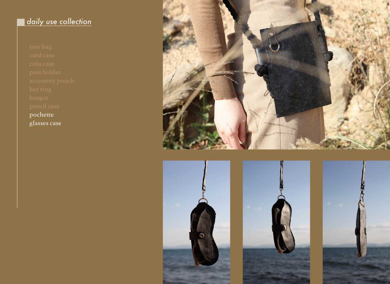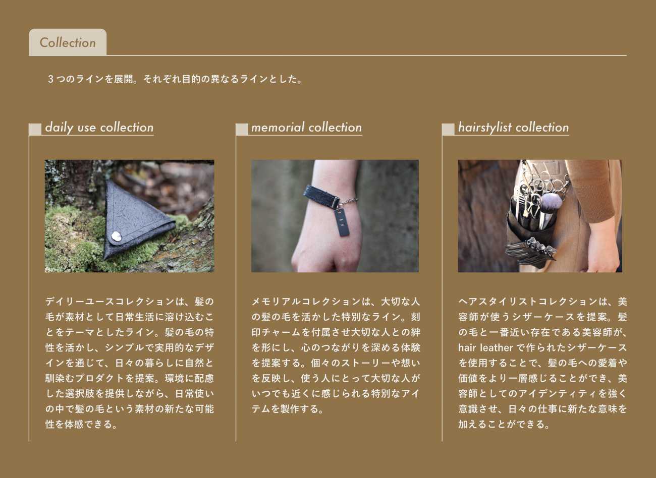 hair leatherから作られるプロダクトは、髪の毛が日常生活に溶け込むことをテーマにした【daily use collection】、大切な人の髪の毛を活かした特別なライン【memorial collection】、髪の毛と一番近い存在である美容師が使うシザーケースを提案する【hairstylist collection】の3つのラインを展開。