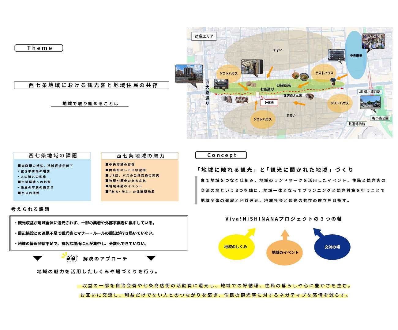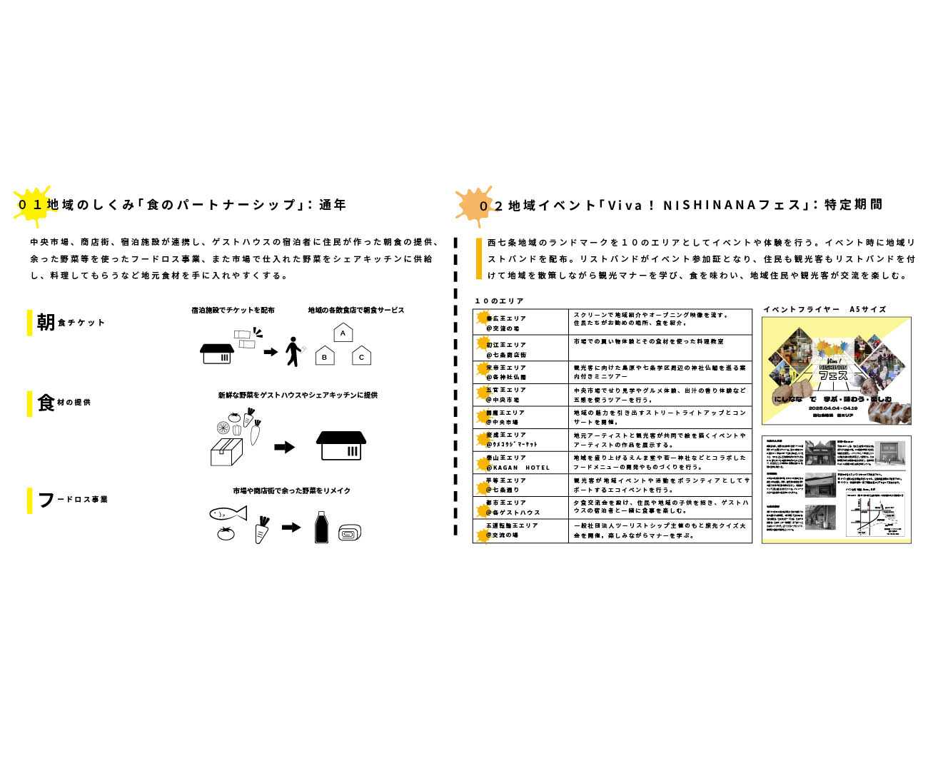 「Viva! NISHINANAプロジェクト」は、①食で地域をつなぐ仕組み、②地域のランドマークを活用したイベント、③住民と観光客の交流の場の3つを軸に展開します。地域全体でプランニングと観光対策を進めることで、地域の発展と利益の還元を図り、地域社会と観光が共存できる仕組みを確立することを目指します。