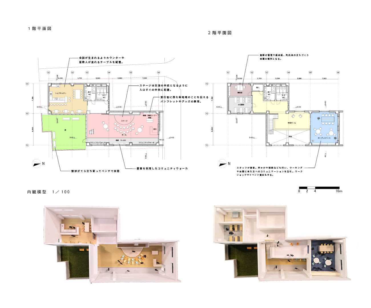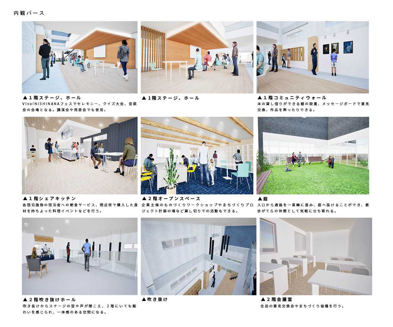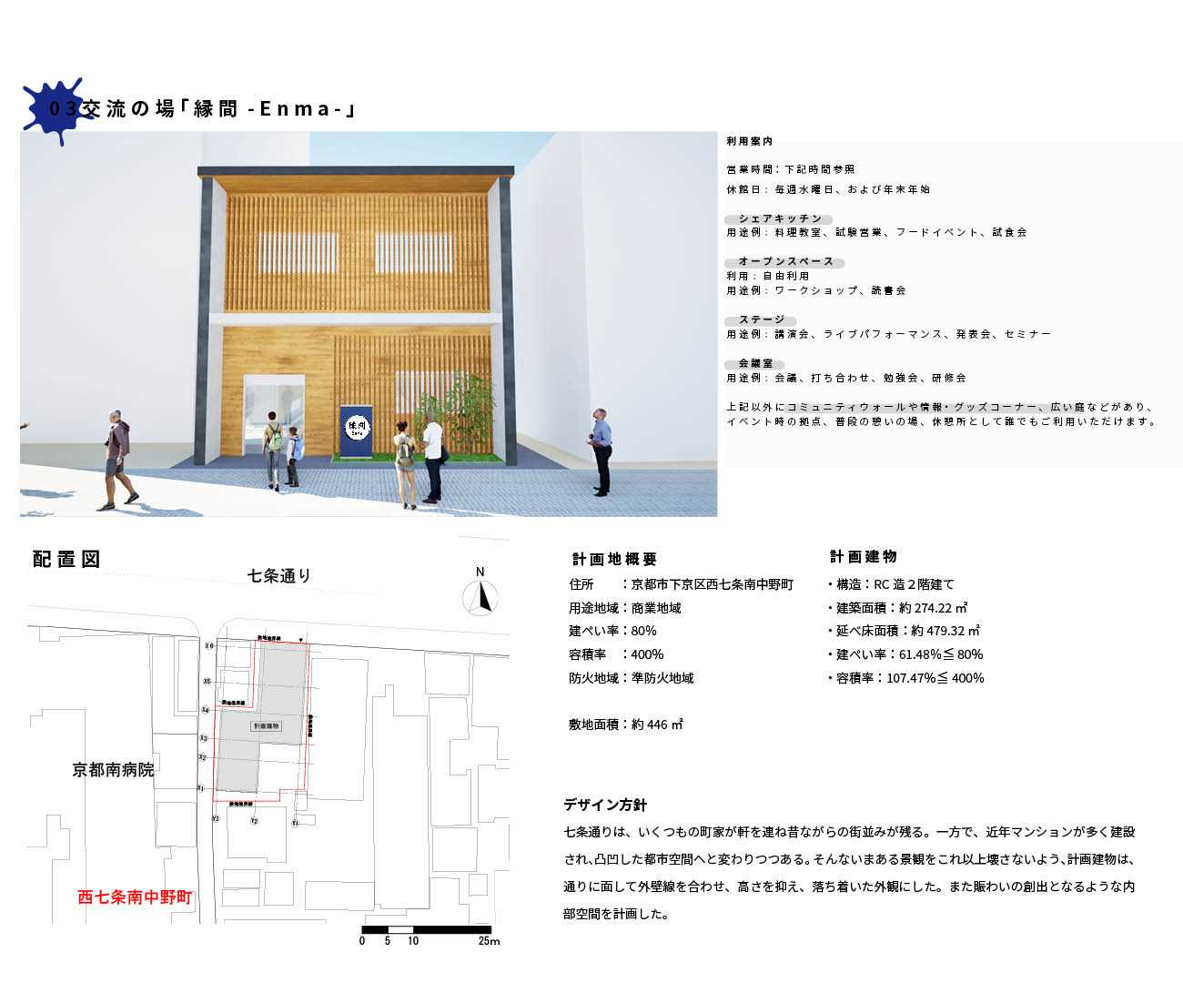 食のパートナーシップでは、中央市場、商店街、宿泊施設が連携し、対象の宿泊施設で朝食チケット配布、地元飲食店で使えるようにして、地域経済への利益還元、宿泊者へ地域の魅力、地域住民との交流につなげる。また市場や商店街で余った野菜を使った料理教室などのフードロス事業も行う。 2つ目に地域のランドマークを活用しサスティナブルや異文化交流をテーマにしたイベントを開催。「七条えんま堂」に祀られる十王に焦点を当て、各十王ごとに「地域・マナー・五感・サスティナブル・異文化交流」などのテーマを設定し、テーマごとにクイズや見学・体験、ステージイベントを行う。地域を散策しながら観光マナーを学び、食を味わい、交流を楽しむ体験を企画する。 3つ目(次ページ)は交流の場を創出する。ステージやオープンスペース、シェアキッチンなどを設け、地域住民の普段利用はもちろん、観光客と交流するための料理会やアクティビティの際にも使用する。地域発展の管理・運営として機能する。