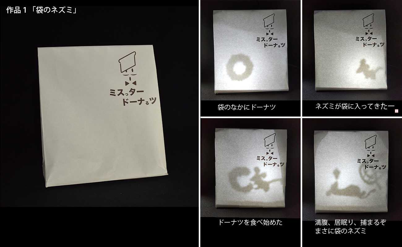「袋のネズミ」と言うけれど、ネズミの鋭い歯はそんな袋でも噛み切ってしまう。それなのに「袋のネズミ」とは? ドーナツの袋に4コマの絵が順番に映し出される。4コマ漫画は、笑い話の基本である「起承転結」の典型例である。