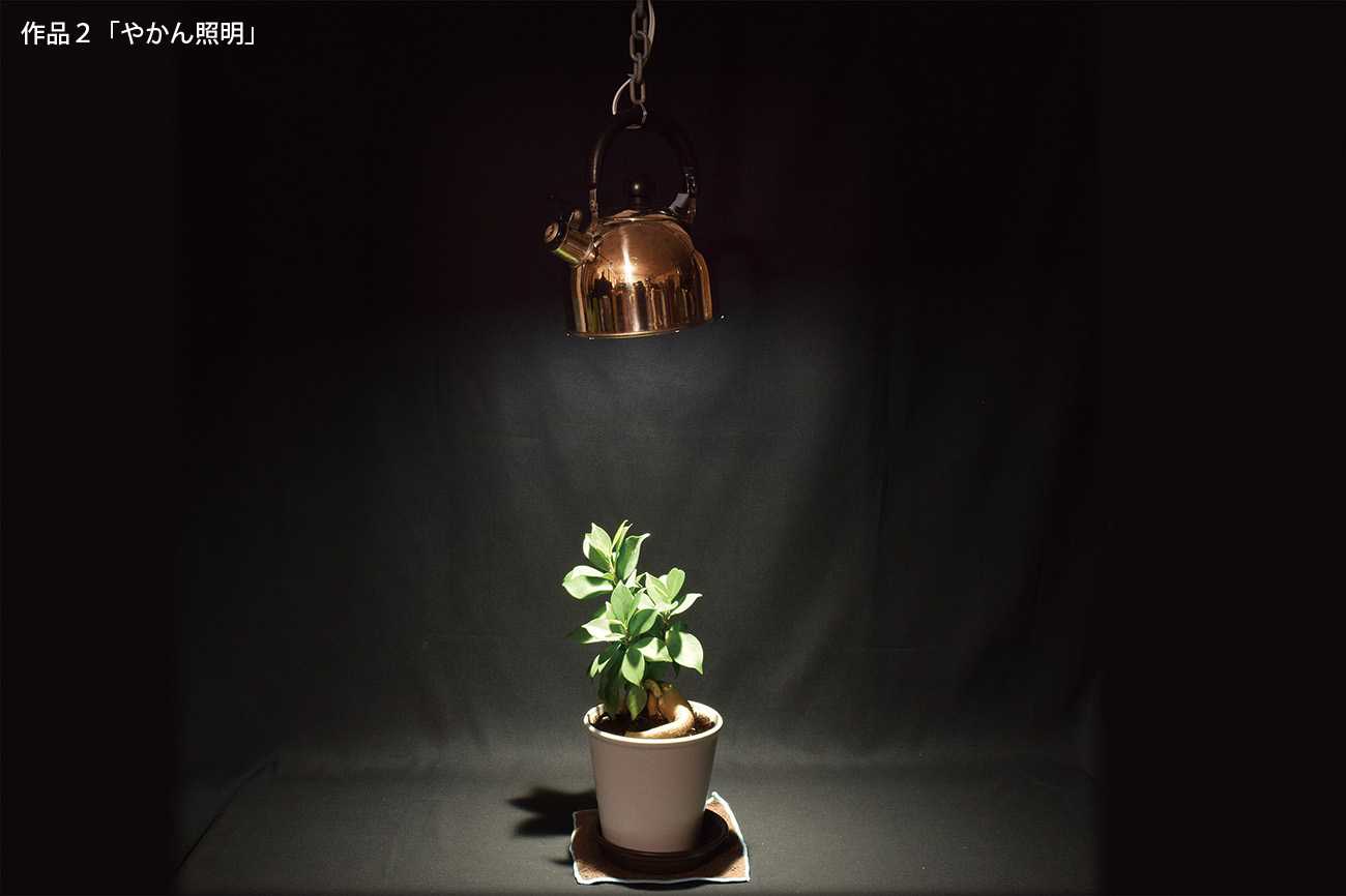 底が抜けたらやかんの役目は果たさない。このやかんは底から「灯」を放つ。昼間は何の役にも立たない、やかん照明である。