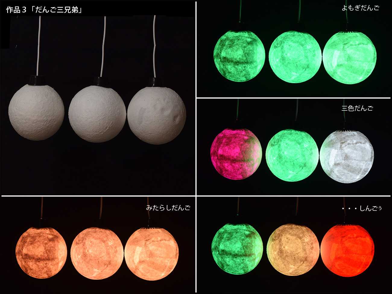 紙製のペンダント灯の色が変化することで、さまざまなだんごが現れる。串団子は関東は4つが多いらしいが、関西は基本的に3つ。でもひとつひとつが大きい!と、関西人は見栄を張る。