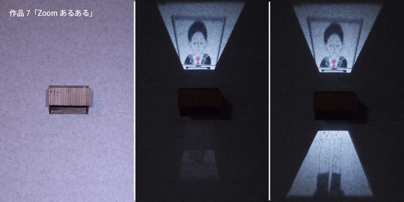 幻灯機のように壁に影絵を映し出す。ネットミーティング中のビジネスマン、カメラに映らないところは。。。