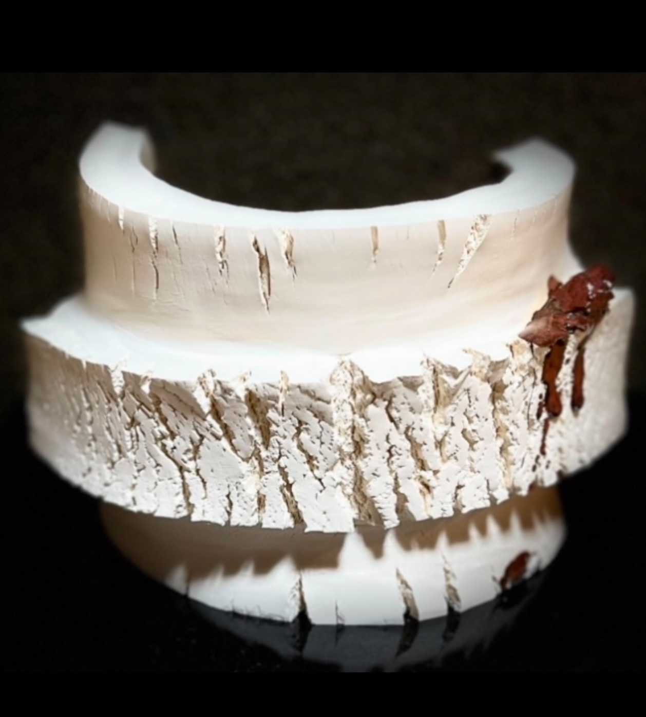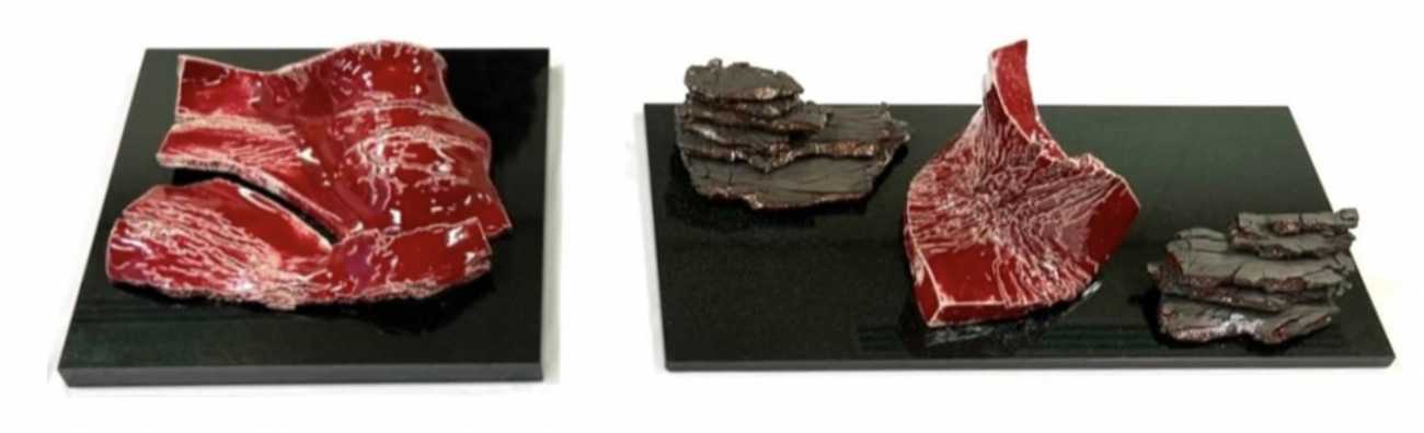主な自身の制作における「亀裂、皺、撓み」の表現としては、亀裂は、地殻変動や自然の力を象徴し、宇宙規模とも言える地球の自然の力強さと過去から未来へ続く未知なる世界へ移る瞬間や時間の経過を表現。皺については、自然の有機的な形態を象徴し、過去から未来へも続く時間の経過や、言葉では表現できない経験の積み重ねなども、偶発的に発生した一つ一つ異なる唯一無二の形状で視覚的に表現。撓みについては、柔軟性や適応力を象徴し、自然の重力の力が形態に与える影響を動的且つ視覚的に表現。形態が自然の流れや動きを反映し、自然の一部であると感じることでもある。現代陶芸においては、伝統技法にとらわれず、新しい表現方法を模索する動きも活発である。今回の行った焼成オブジェの他にも、「土の焼かないオブジェ」の制作は、その一環として位置づけられる。土の持つ自然な表情をそのまま活かすことで、自然と人間の関係性を再考する機会を提供し、現代陶芸の多様な、表現方法を探求することができる。