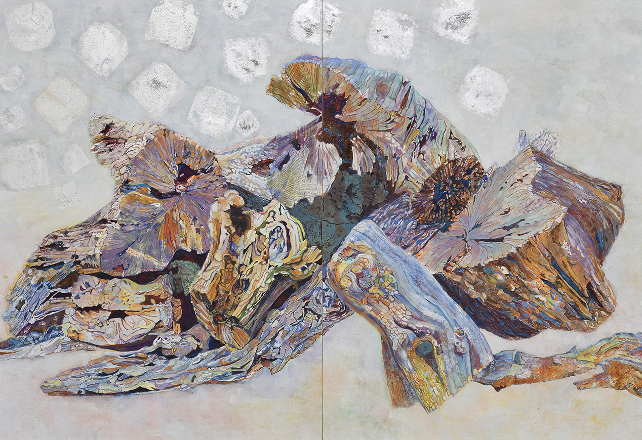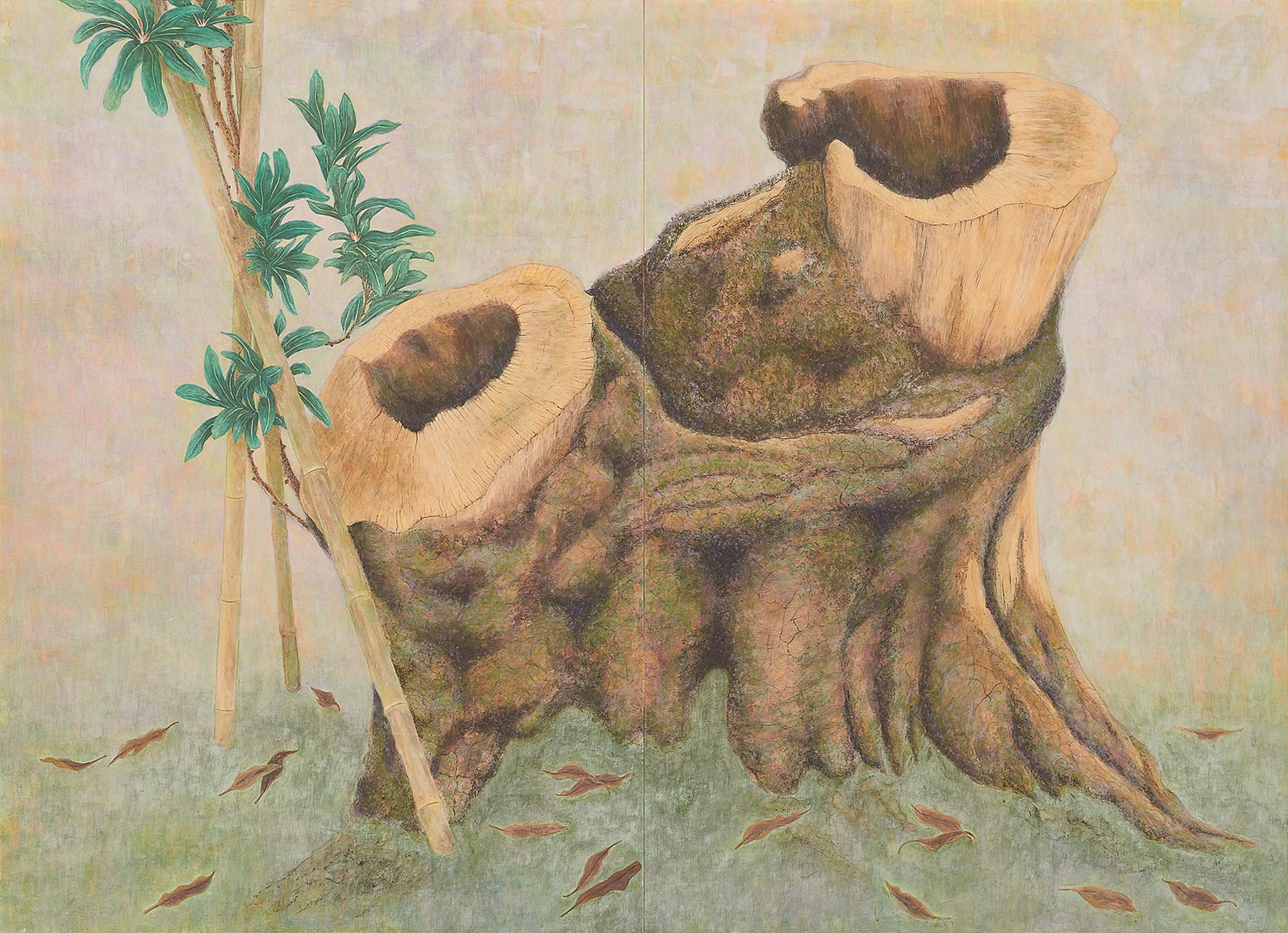 ご近所の柿の木が切り倒され、庭の片隅に無造作に置かれていた。日差しを浴びた倒木達はお互いが何やらわさわさと話しているように感じた。この何とも言えないドキドキ感を絵にしたいと思い卒業制作の題材に選んだ。絵の中に樹齢の唄が聞こえるように、一筆一筆思いを込めて。
