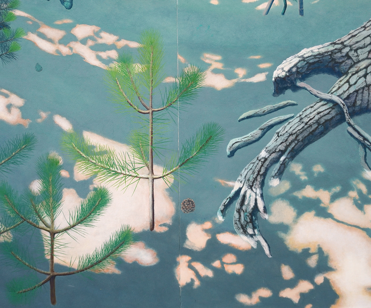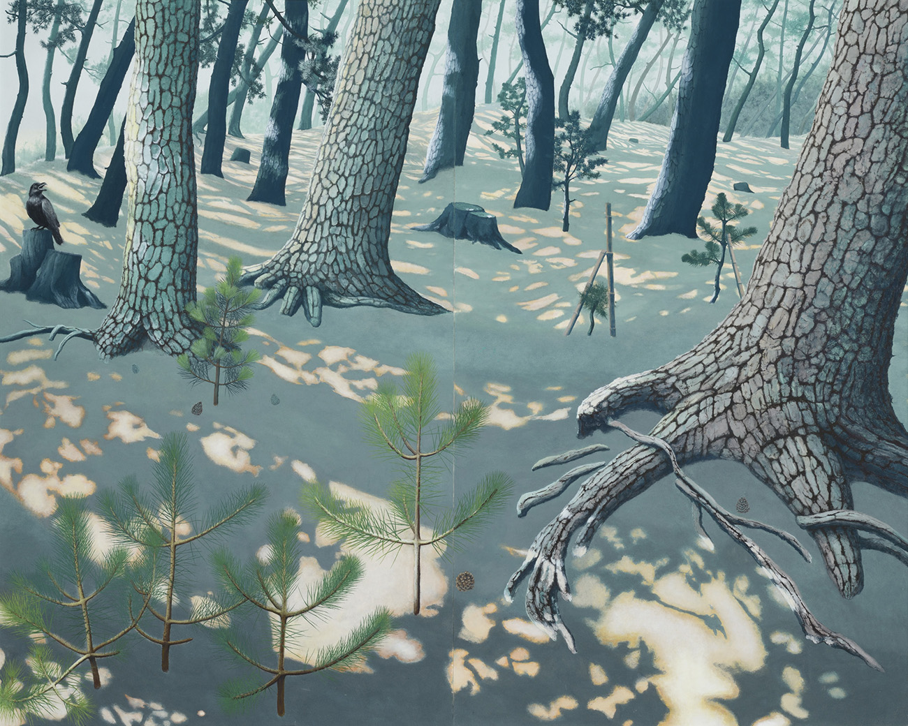 自宅裏庭から続く松林が午後の陽を受けて光り・陰る様である。それは子供の頃と変わりない風景である一方、我が家の代々のペットの墓を守ってきた大木は幼木に置き換わり、松の世代交代を想わずにはいられない。