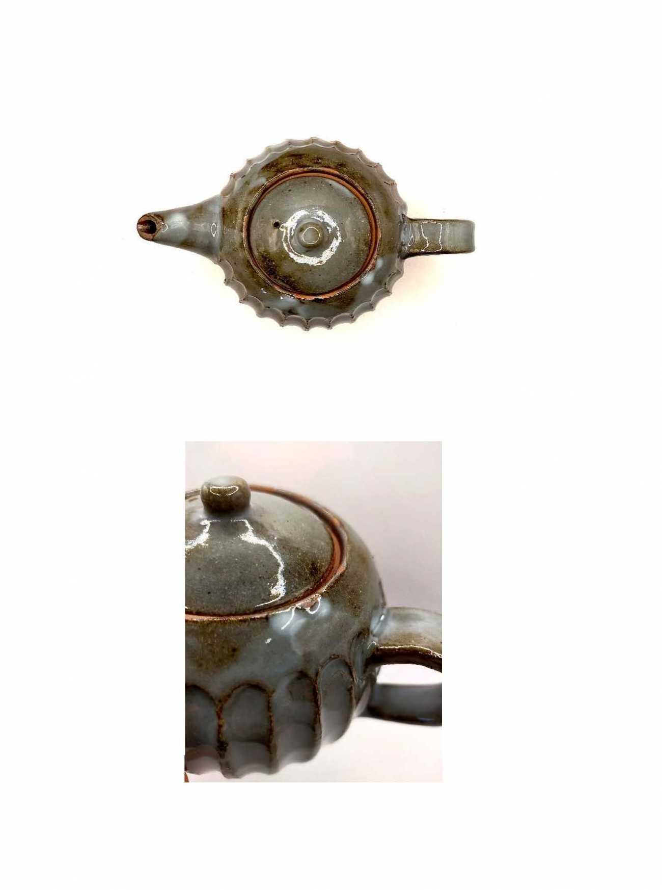 イガ灰の釉薬のたまりの箇所としのぎの稜線部分の土肌がコントラストを描いている。 日々の生活に寄り添い使いやすいことも重要であるため、しのぎを施し軽くなるよう工夫した。 どこかクリのイガを思わせる佇まいになったポットである。