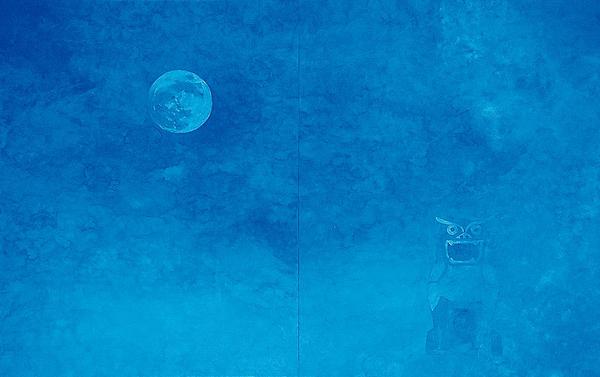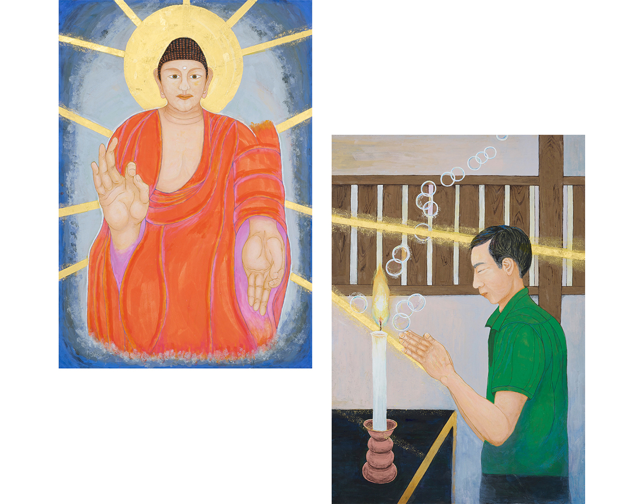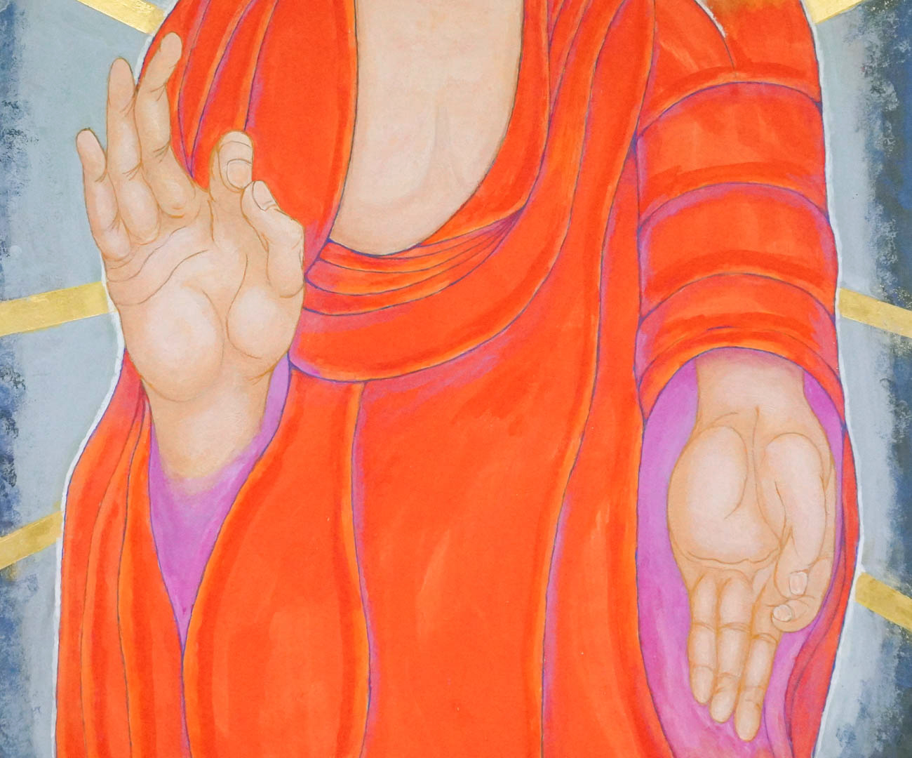 阿弥陀仏には梵名でアミターバ(無量光)とアミターユス(無量寿)の二つの名号があり、無限の光明で人々を救う如来とされています。仏の手印は、来迎印を結んでおり本来は往生云々の意味合いがありますが、人知を超えた存在の神仏に、無心に手を合わせることの尊さを表現したいとの想いで画は制作しました。