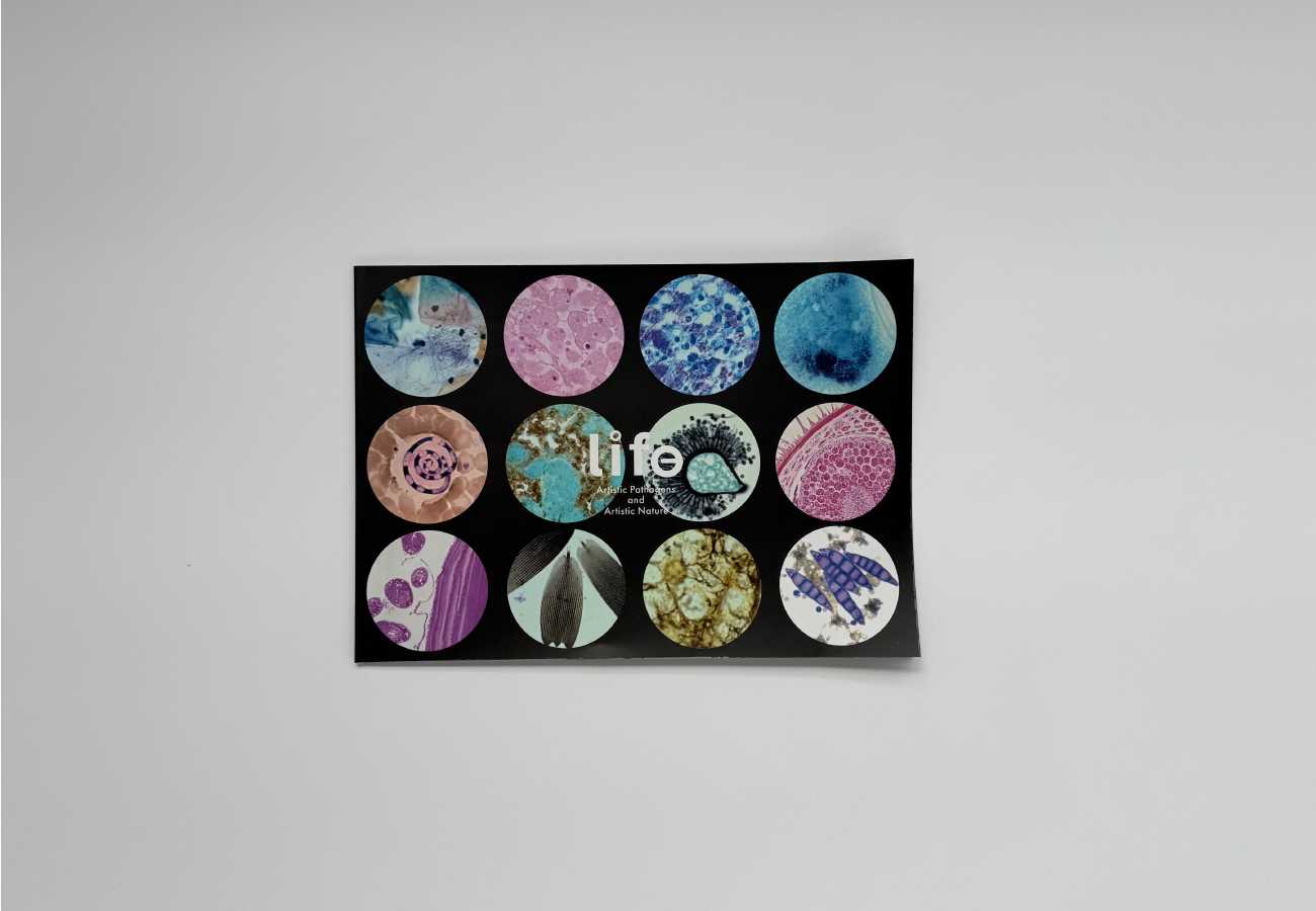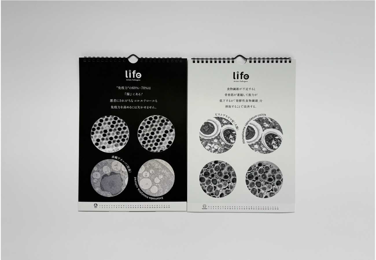 病理医が病理標本を顕微鏡でみたときの病原体(pathogens)と自然(Nature)の組織像の""美しいミクロの世界""を身近な存在として表現できないかと考えました。病理診断画像は主に病原体、ウイルス、自然(植物・虫類)を顕微鏡でみたときの画像で、どれも人間と共に生きる小さな者たちです。病理診断画像の美しい世界観を、『万華鏡』でみる病理診断画像として表現しました。万華鏡で使った病理診断画像の解説『冊子』を付属。また、1日いちにちを共に生きる表現形態として『カレンダー』を制作しました。